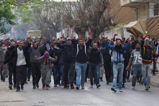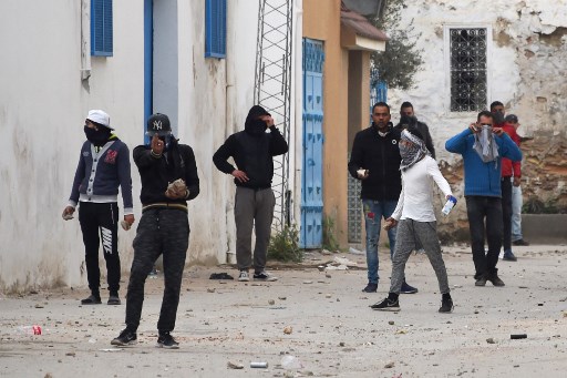 Tunisian protestors throw stones towards security forces in Tunis’ Djebel Lahmer district early on January 10, 2018 after price hikes ignited protests in the North African country. Fresh scuffles broke out overnight night between Tunisian protesters and police, a day after the death of a man in violent demonstrations over rising costs and government austerity.AFP