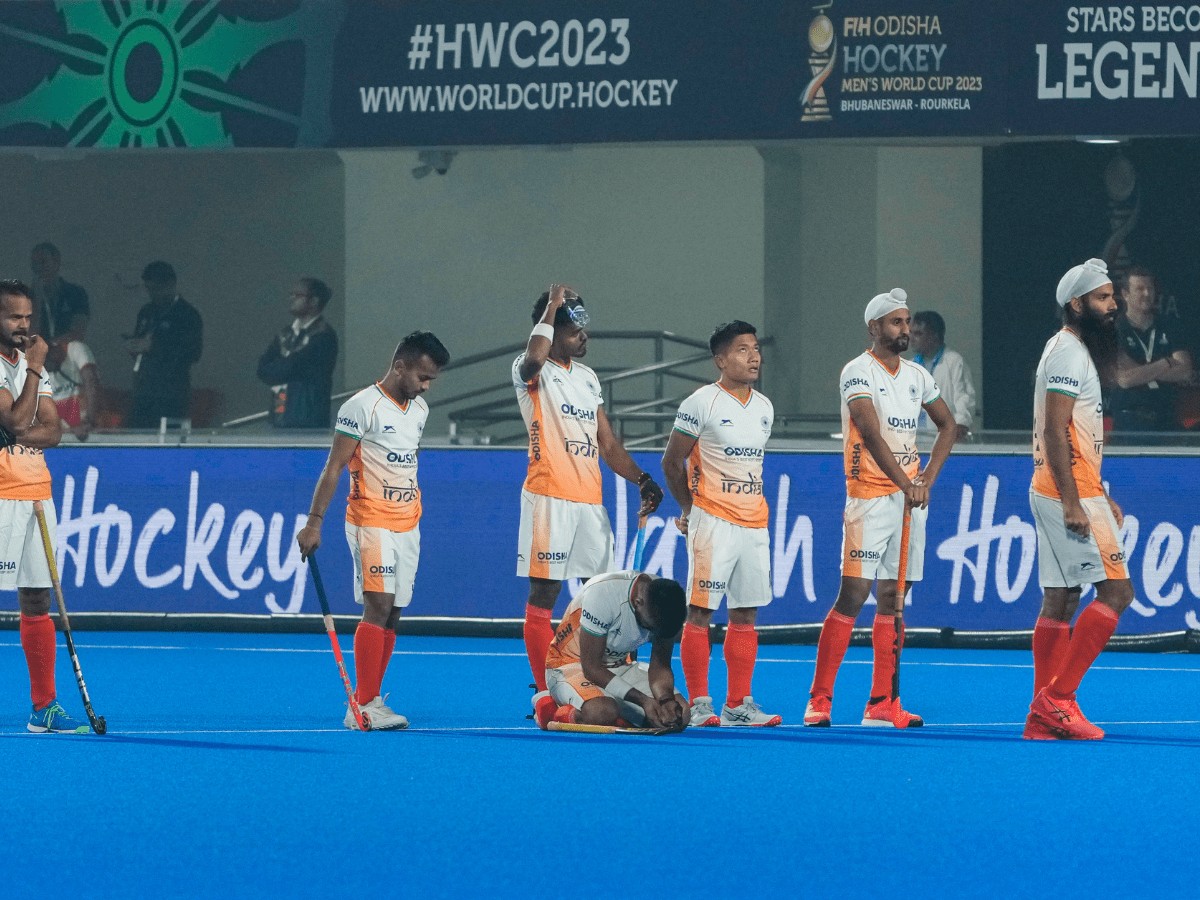 Bhubaneswar: Indian players react after losing against New Zealand, in the 2023 Men’s FIH Hockey World Cup match in Bhubaneswar, Sunday, Jan. 22, 2023. (PTI Photo/Gurinder Osan)Bhubaneswar: A New Zealand player celebrates the win against India as Indian players react after losing the match in the 2023 Men’s FIH Hockey World Cup, in Bhubaneswar, Sunday, Jan. 22, 2023. (PTI Photo/Gurinder Osan)Bhubaneswar: New Zealand players celebrate after winning against India, in the 2023 Men’s FIH Hockey World Cup match in Bhubaneswar, Sunday, Jan. 22, 2023. (PTI Photo/Gurinder Osan)Bhubaneswar: Indian goalkeeper PR Sreejesh reacts in pain after getting injured during the penalty shootout against New Zealand, in the 2023 Men’s FIH Hockey World Cup match in Bhubaneswar, Sunday, Jan. 22, 2023. (PTI Photo/Gurinder Osan)Bhubaneswar: Indian fans cheer during the penalty shootout against New Zealand, in the 2023 Men’s FIH Hockey World Cup match in Bhubaneswar, Sunday, Jan. 22, 2023. (PTI Photo/Gurinder Osan)Bhubaneswar: India’s Varun Kumar attempts a drag flick at the goalmouth during an unsuccessful penalty corner attempt against New Zealand, in the 2023 Men’s FIH Hockey World Cup match in Bhubaneswar, Sunday, Jan. 22, 2023. (PTI Photo/Gurinder Osan)Bhubaneswar: New Zealand players celebrate their second goal against India, in the 2023 Men’s FIH Hockey World Cup match, in Bhubaneswar, Sunday, Jan. 22, 2023. (PTI Photo/Gurinder Osan)