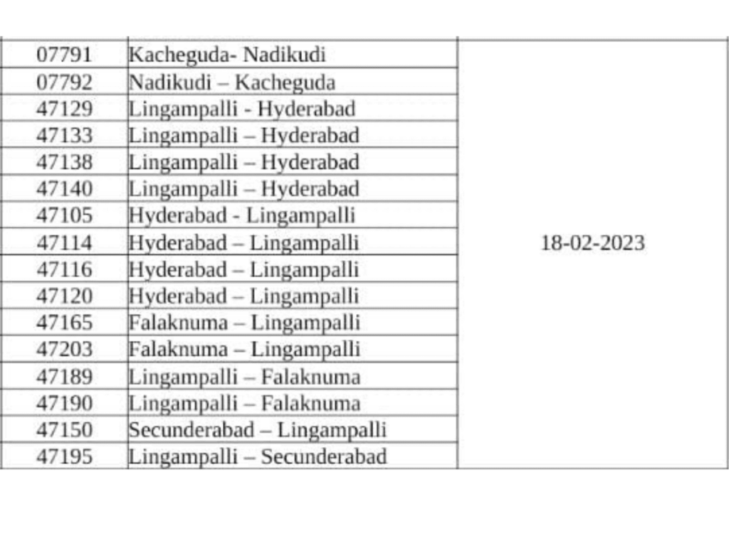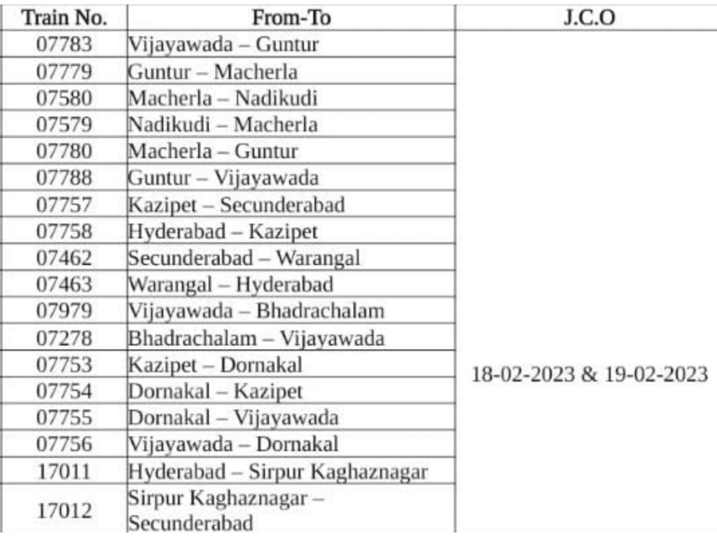 Hyderabad: The South Central Railways (SCR) has announced the cancellation of 34 trains owing to operational reasons on Saturday and Sunday.