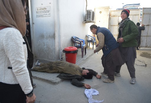An Afghan man faints at a hospital following explosions at a Shiite cultural centre in Kabul on December 28, 2017.