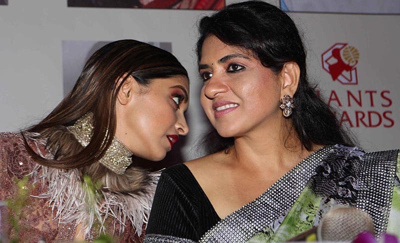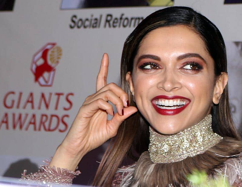 Bollywood actor Deepika Padukone greets former mumbai Shariff Nana Chudasama during the 44th Giants International Award ceremony, in Mumbai on saturday night. UNI PHOTO