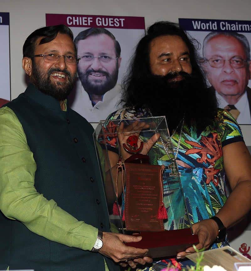 MUMBAI, SEP 18 (UNI)- Union HRD Minister Prakash Javdekar presents the 44th Giants International Award to Dr Gurmeet Ram Rahim Singhji Insan, in Mumbai on Saturday night. UNI PHOTO-11U