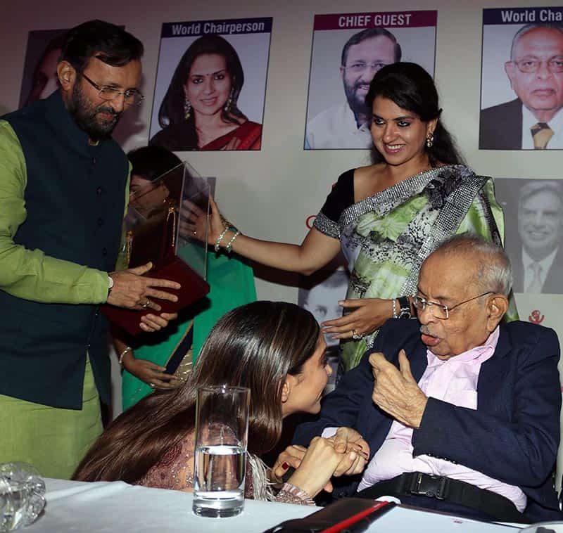 MUMBAI, SEP 18 (UNI)- Bollywood actor Deepika Padukone greets former mumbai Shariff Nana Chudasama during the 44th Giants International Award ceremony, in Mumbai on saturday night. UNI PHOTO-11U