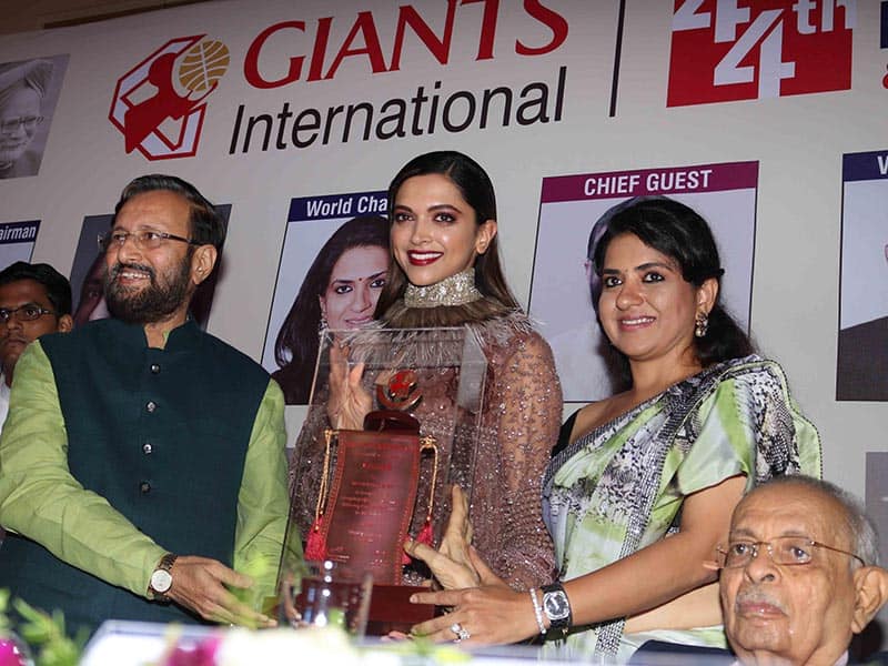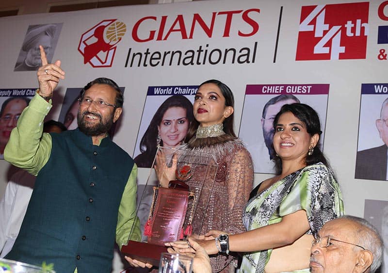 MUMBAI, SEP 18 (UNI)-Union HRD Minister Prakash Javdekar presents the 44th Giants International award to Bollywood actor Deepika Padukone in mumbai on saturday night. UNI PHOTO-8U