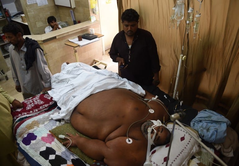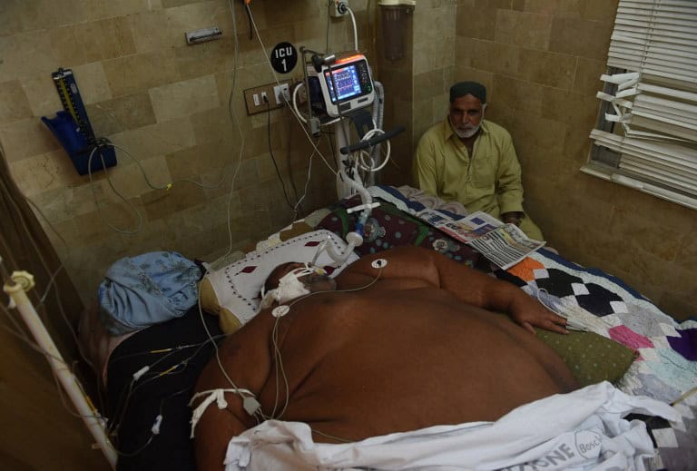 Weighing 490 kilograms (1,080 pounds), Jabbar is fighting multiple organ failures after dealing with morbid obesity where he has been unable to move his hands, legs or his head. / AFP PHOTO / ASIF HASSAN