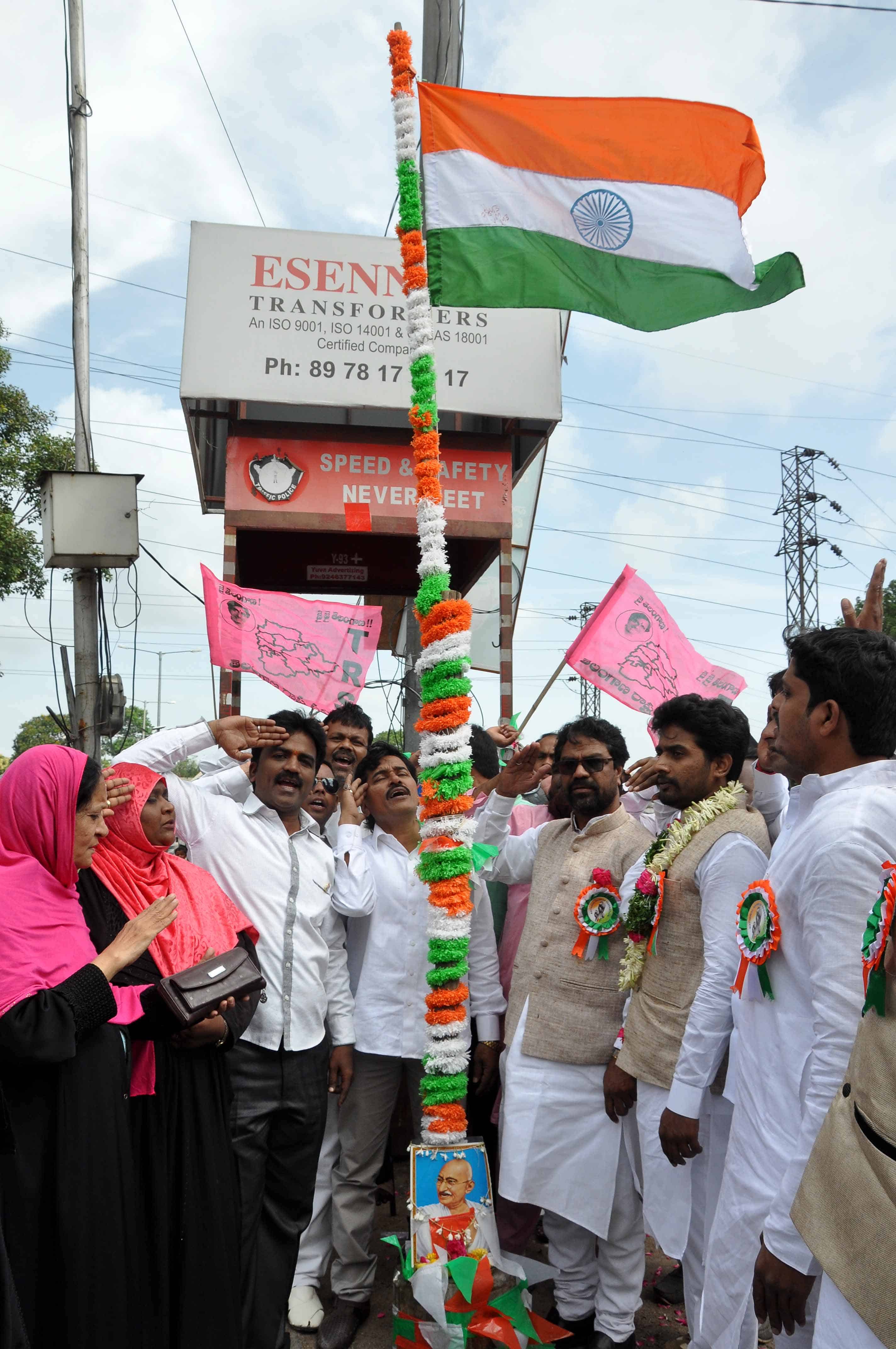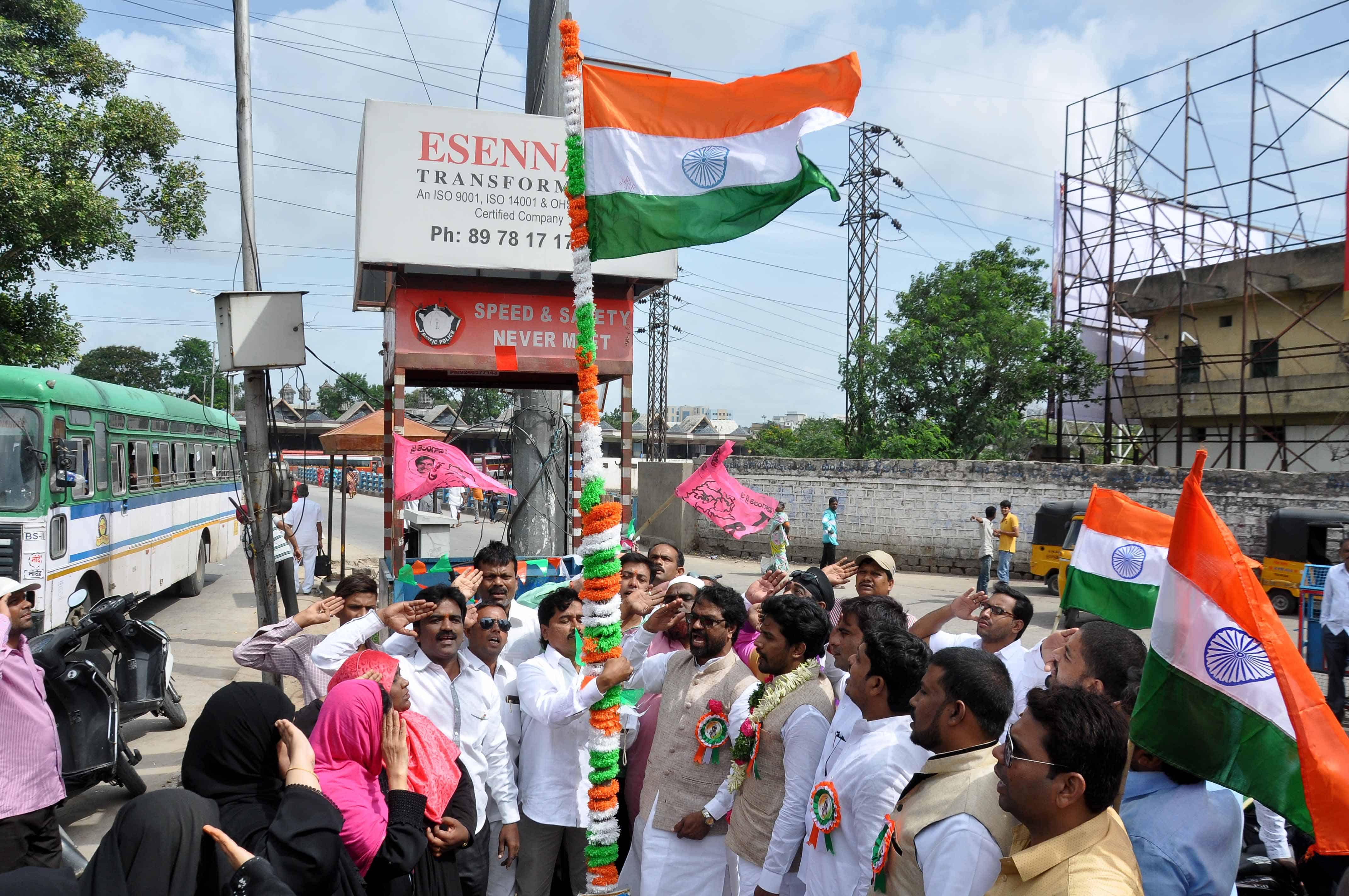 TRS G.secretary & Charminar Constituency Incharge Mir Inayath ali Baqri National Flag Hoisting in frontof MGBS at, Hyderabad:Photo:Laeeq