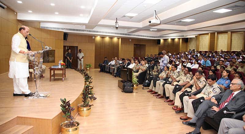 Union Home Minister Rajnath Singh addressing the IPS Probationers at Sardar Vallabhbhai Patel National Police Academy, in Hyderabad on Friday. UNI PHOTO