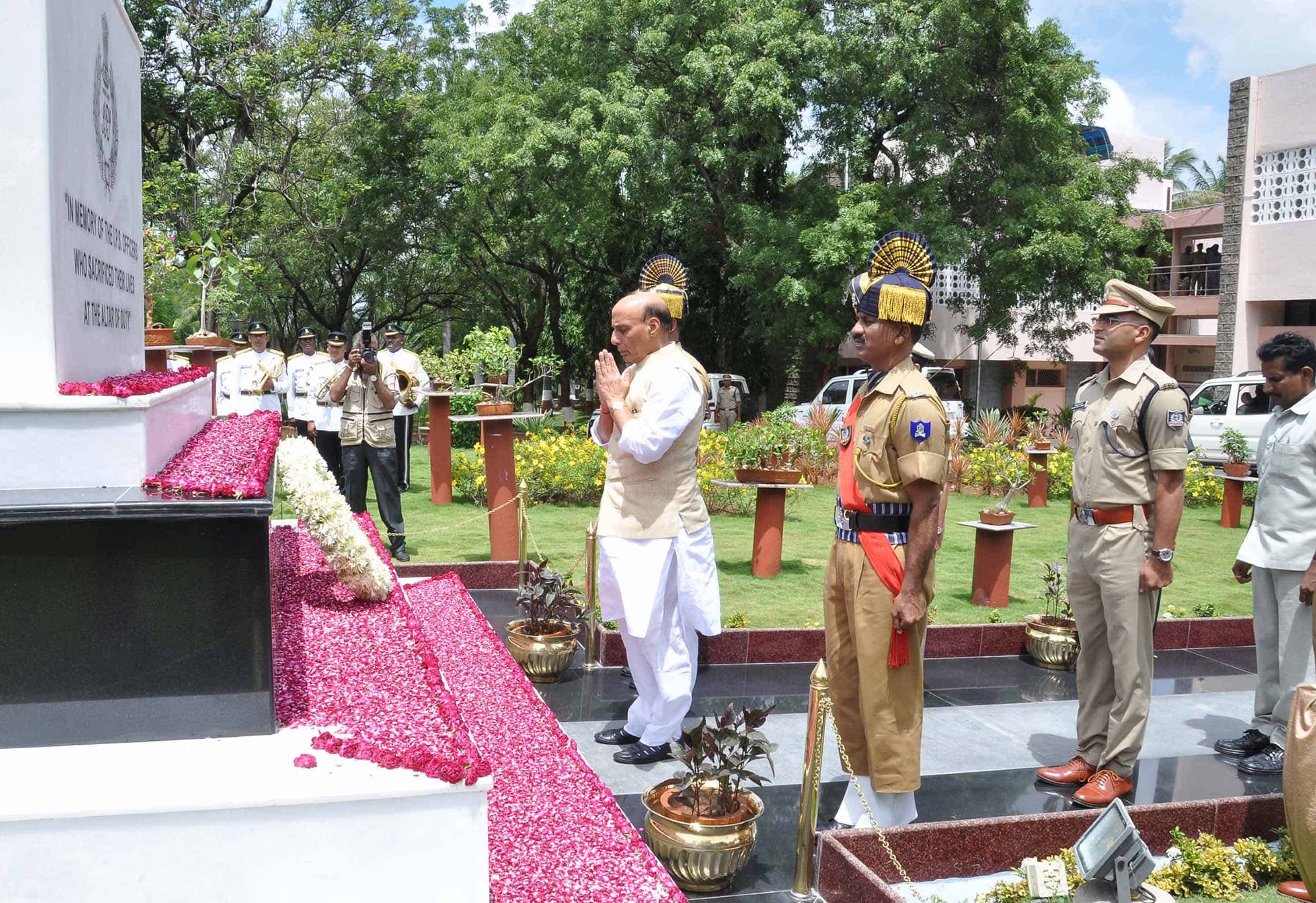 HYDERABAD, SEP 2 (UNI):- Union Home Minister Rajnath Singh paying respect to the Martyrs column, at Sardar Vallabhbhai Patel National Police Academy, in Hyderabad on Friday. UNI PHOTO-154U