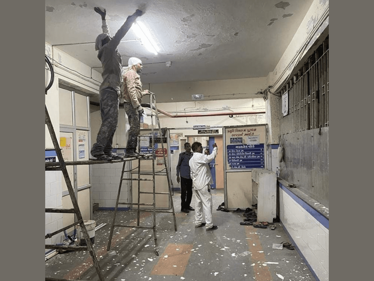 The photos posted by Congress on Twitter showed overnight repair work going on inside the Morbi hospital, which included a fresh coat of paint, new tiles on the walls, and minor construction work to beautify the hospital ahead of PM Modi’s visit to the facility on Tuesday.