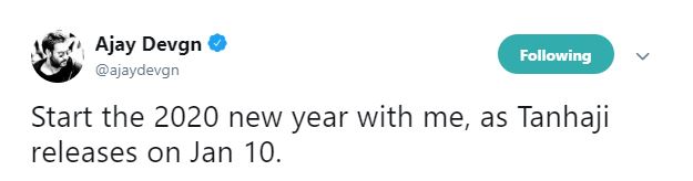 He wrote, “Start the 2020 new year with me, as Tanhaji releases on Jan 10.”