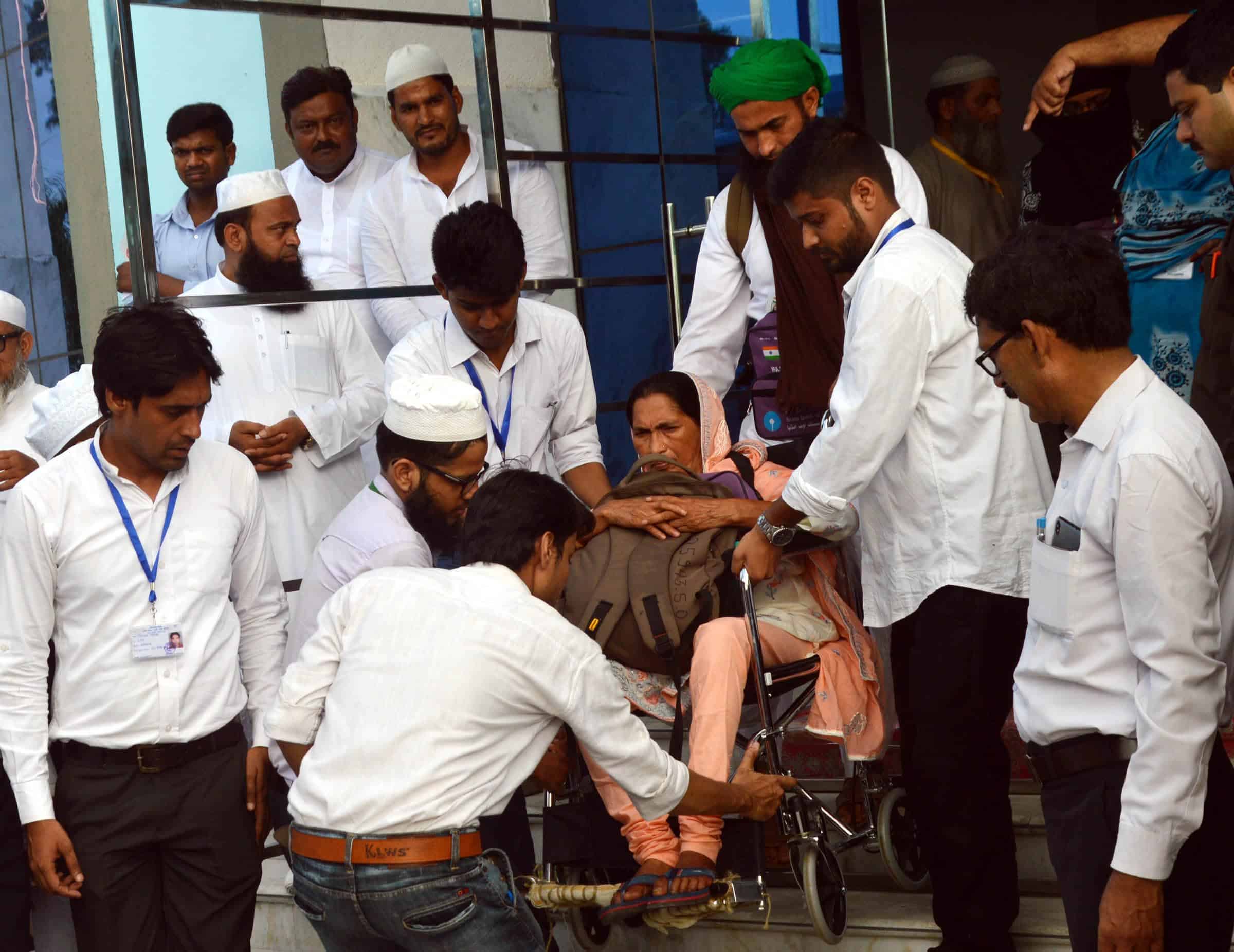 LUCKNOW, AUG 10 (UNI) Uttar Pradesh Parliamentary and Muslim Waqf Minister Azam Khan visiting Haj pilgrims before left the first batch for Haj, at the Haj House in Lucknow on Wednesday.