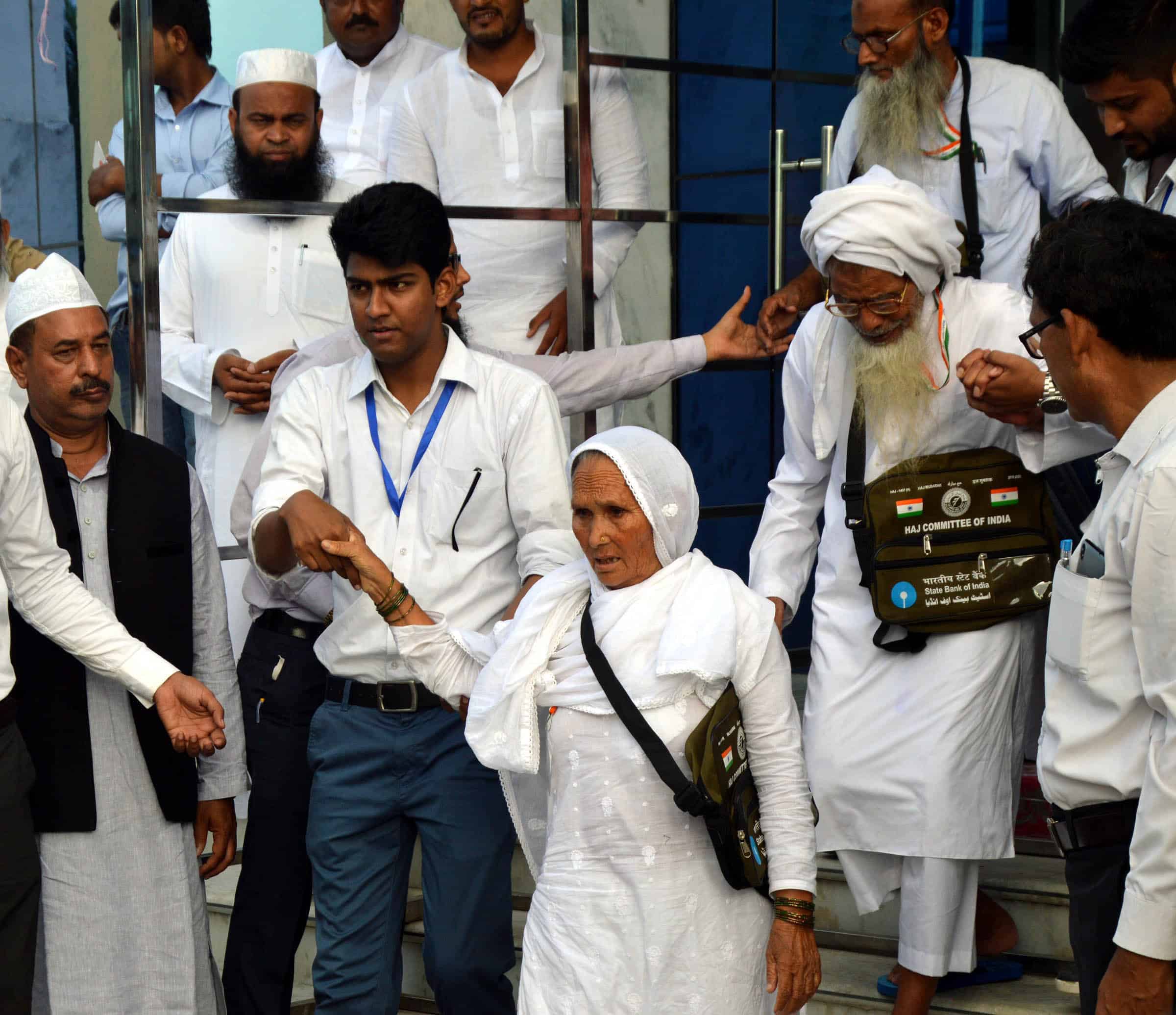 LUCKNOW, AUG 10 (UNI)- First bach Haj pilgrims on way to airport from Haj House in Lucknow on Wednesday. UNI PHOTO-156u