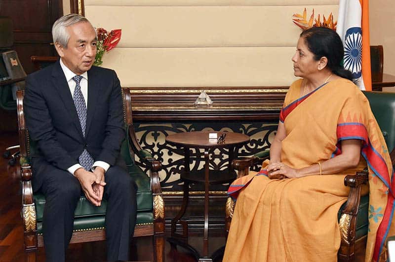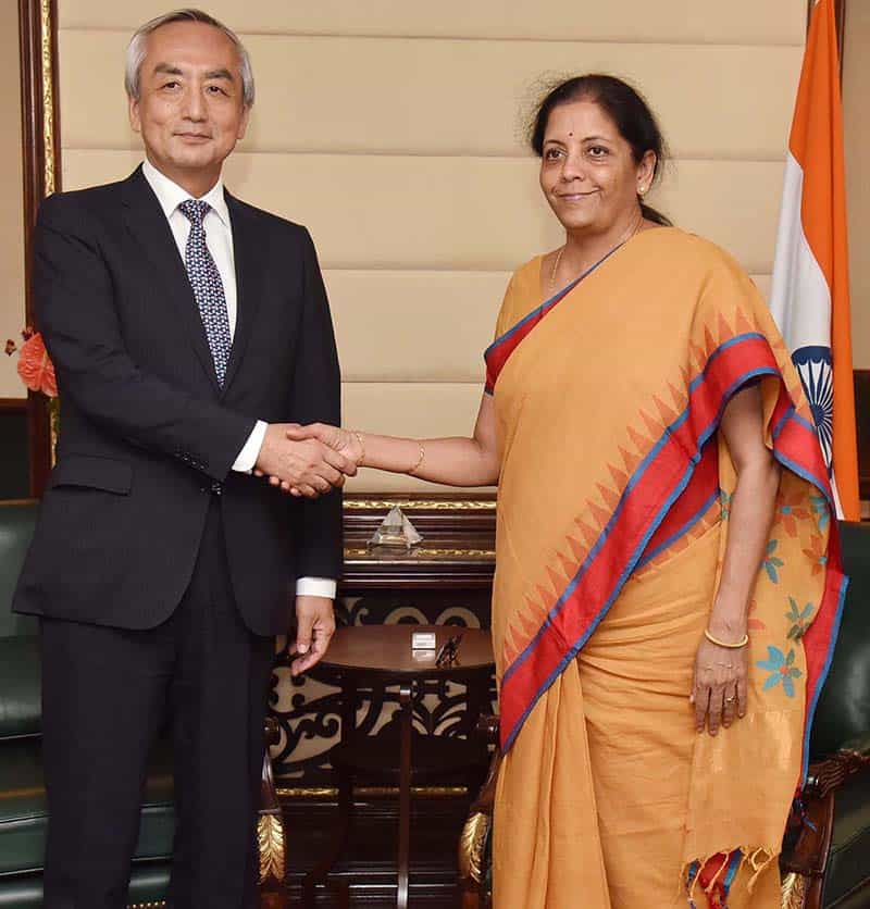 Ambassador of Japan to India Kenji Hiramatsu meeting the Minister of State for Commerce & Industry (I/C) Nirmala Sitharaman in New Delhi on Tuesday. UNI PHOTO