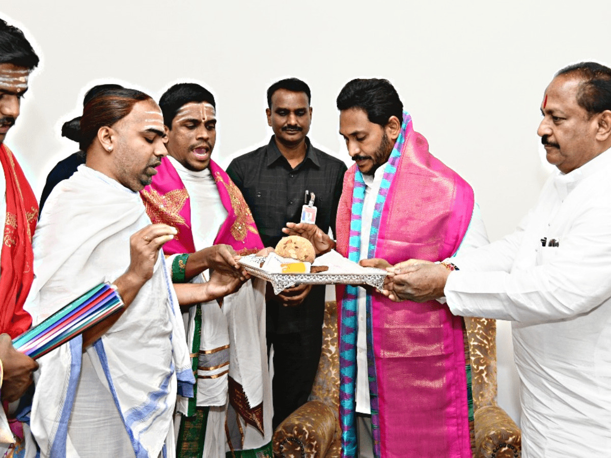 Amaravati: Andhra Pradesh Chief Minister Y.S. Jagan Mohan Reddy on Sunday took the blessings of Vedic Pandits of two leading temples on the occasion of New Year day.