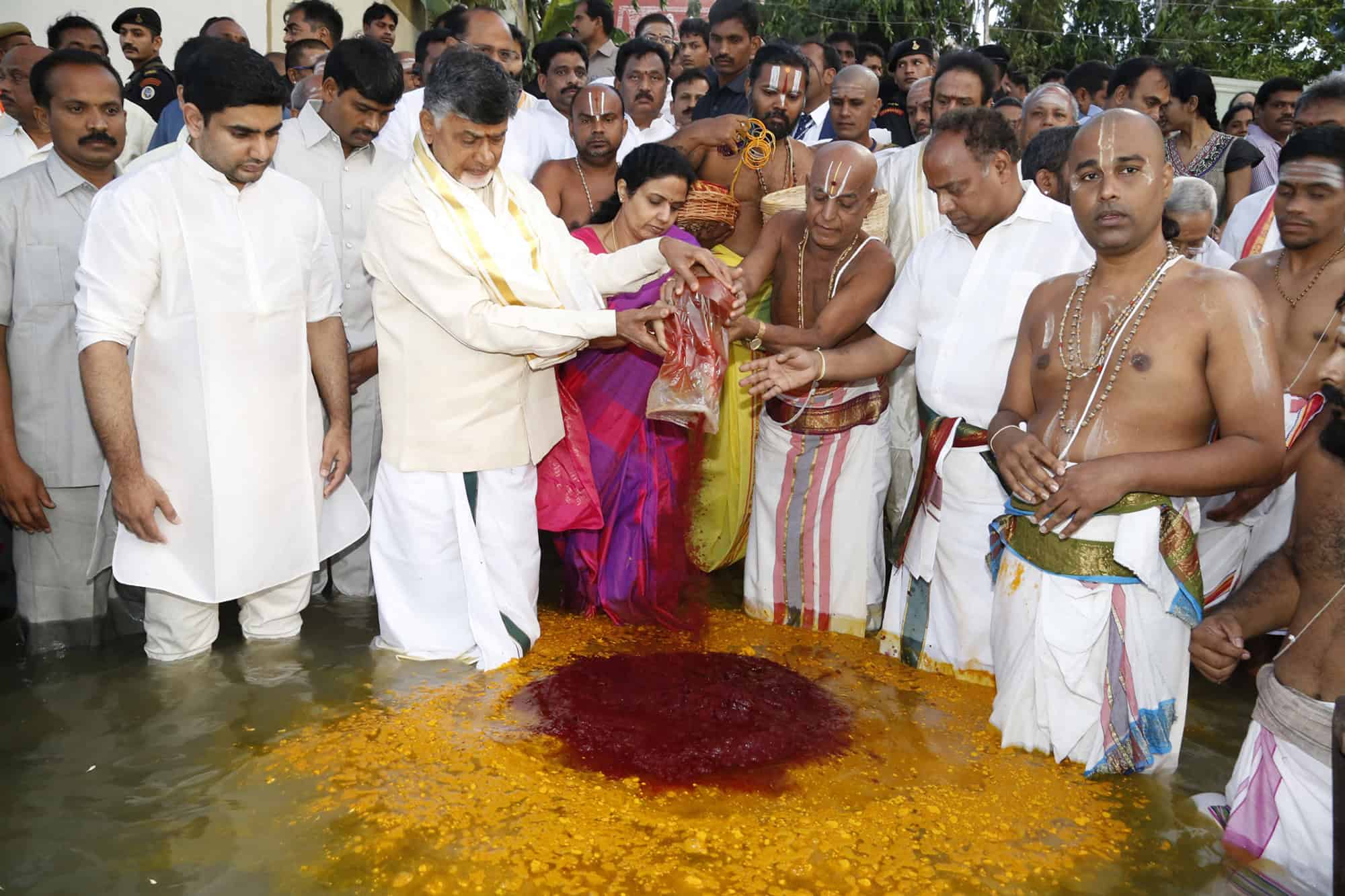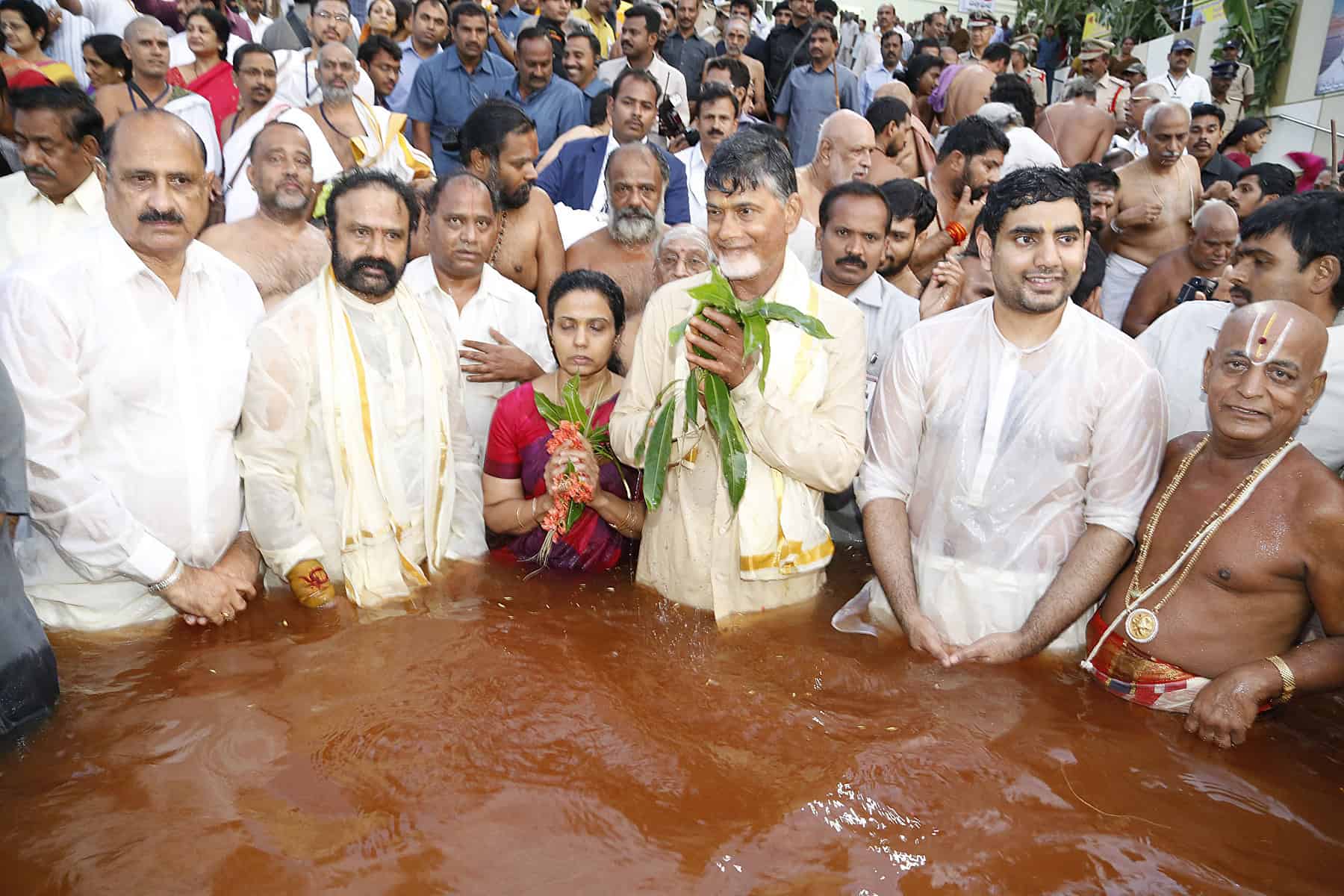 Andhra Pradesh Chief Minister N Chandrababu Naidu with wife N Bhubaneswari taking holy dip in Krishna river after inaugurating the 12-day Krishna Pushkaram, in Vijayawada on Friday. UNI PHOTO