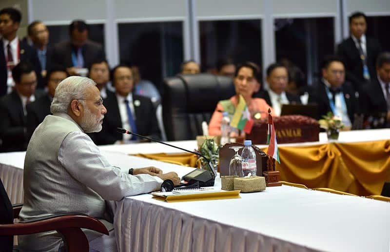 VIENTIANE, SEP 8 (UNI):- Prime Minister Narendra Modi addressing at the 14th ASEAN-India Summit, at Vientiane, Lao PDR on Thursday. UNI PHOTO-1U