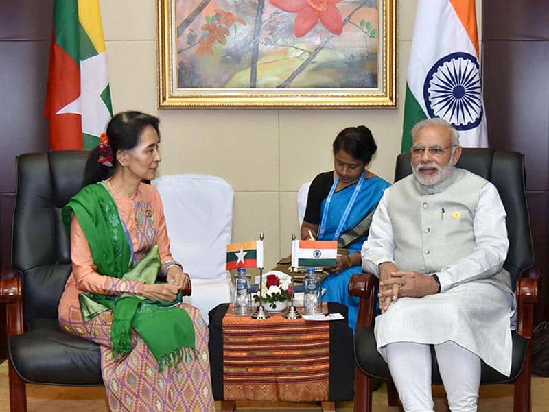 VIENTIANE, SEP 8 (UNI):- State Counsellor of Myanmar, Aung San Suu Kyi meeting the Prime Minister, Narendra Modi, on the 14th ASEAN-India Summit, at Vientiane, Lao PDR on Thursday. UNI PHOTO – 15U