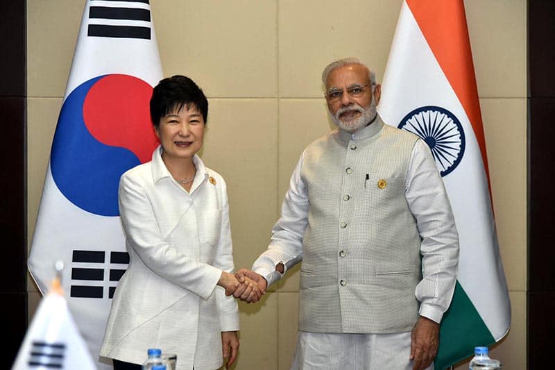 VIENTIANE, SEP 8 (UNI):- Prime Minister Narendra Modi meeting the President of South Korea, Park Geun-hye, on the sidelines of the14th ASEAN-India Summit, at Vientiane, Lao PDR on Thursday. UNI PHOTO-4U