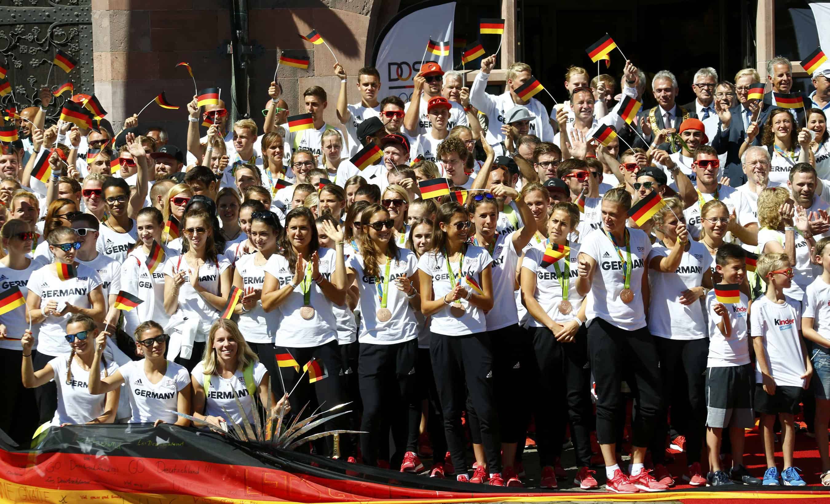 FRANKFURT, AUG 23:- German athletes celebrate with fans after their return from the 2016 Rio Olympics in Frankfurt, Germany August 23, 2016. REUTERS-13R