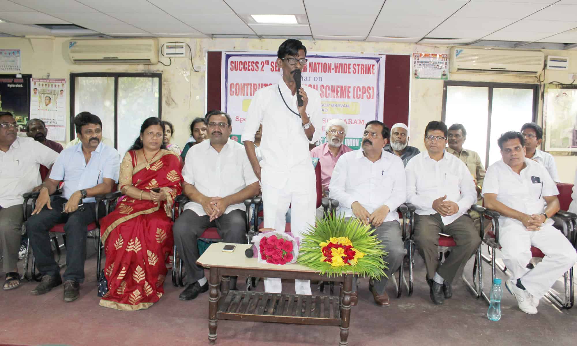 National president of Employees Union Comrade Muttu Sundaram is seen addressing at TNGOs Bhavan, Nampally during one day seminar on 2nd September’s national strike and contributory pension scheme (CPS). TNGOs honorary president Devi Prasad, President Karam Ravindar Reddy, General Secretary Abdul Hameed, Greater Hyderabad President S M Hussaini Mujeeb and large numbers of state employees can also be seen. (Photo: Zabi)