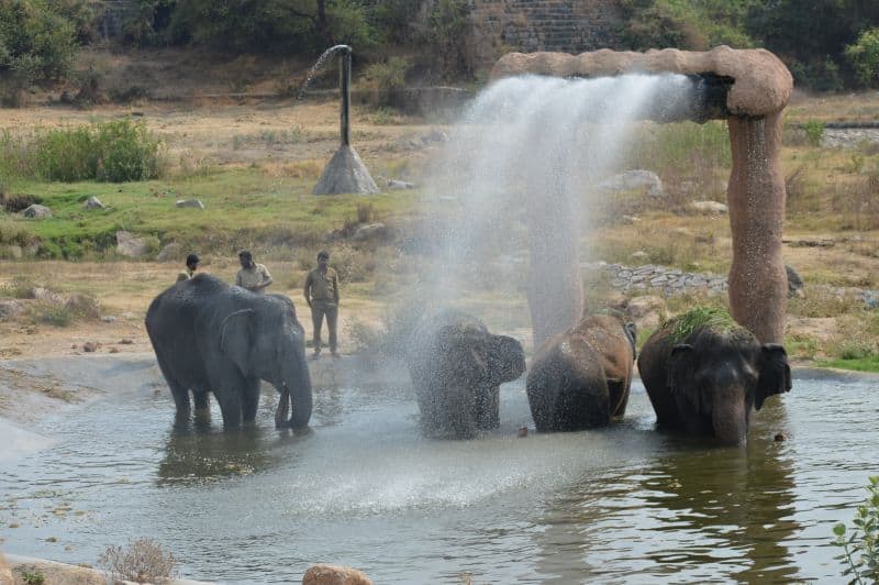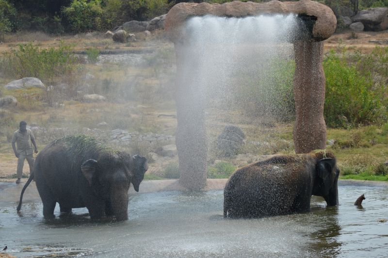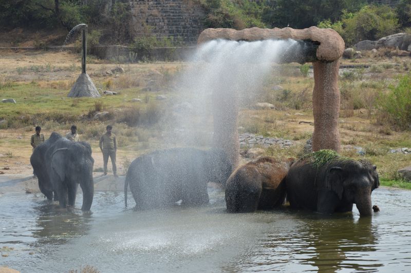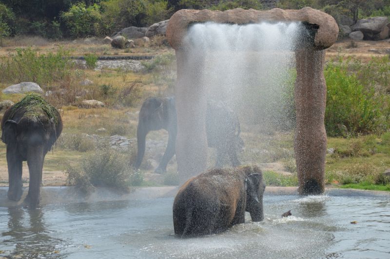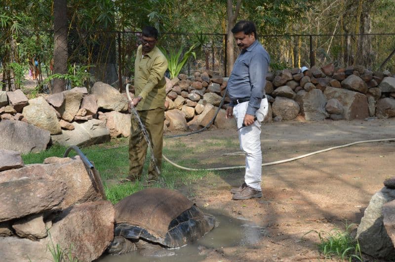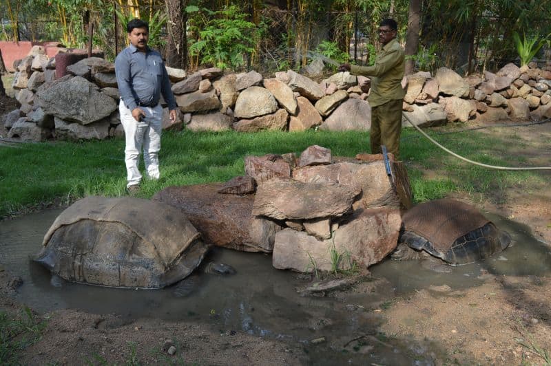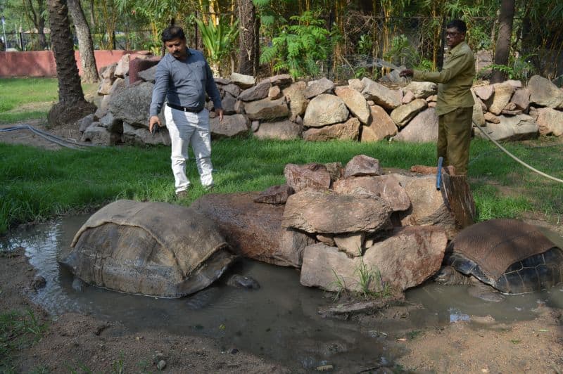 Tiger, Elephants, tortoise, and Monkeys Can be seen in their enchlaves during water sprinkling on a hot day in Nehru Zoological Park (Photos: Murli)
