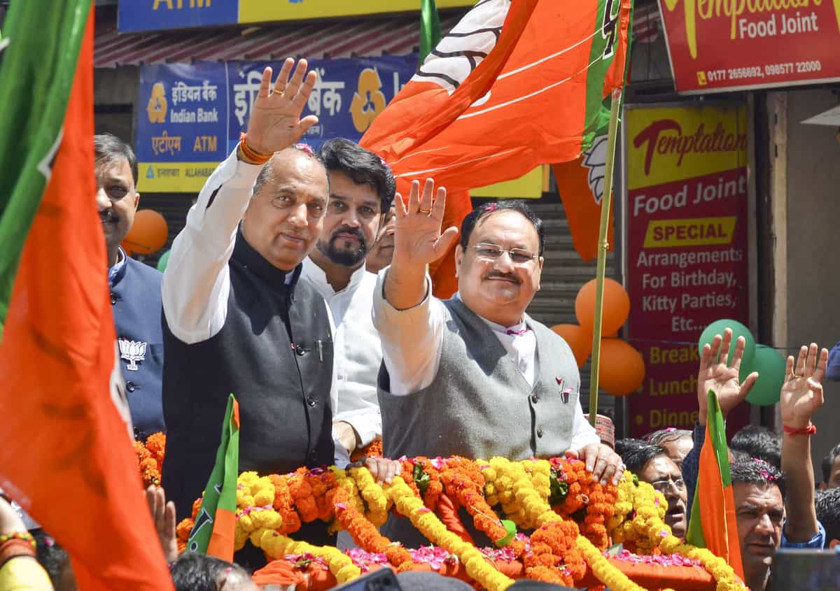 Shimla: BJP National President JP Nadda, Union Minister Anurag Thakur and Himachal Chief Minister Jai Ram Thakur during a roadshow in Shimla, Saturday, April 9, 2022. (PTI Photo)