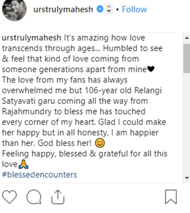 He added, “The love from my fans has always overwhelmed me but 106-year old Relangi Satyavati garu coming all the way from Rajahmundry to bless me has touched every corner of my heart. Glad I could make her happy but in all honesty, I am happier than her. God bless her!” (sic)