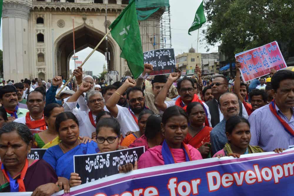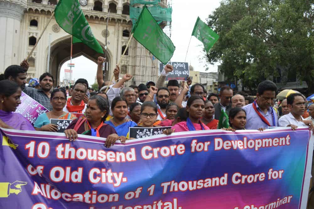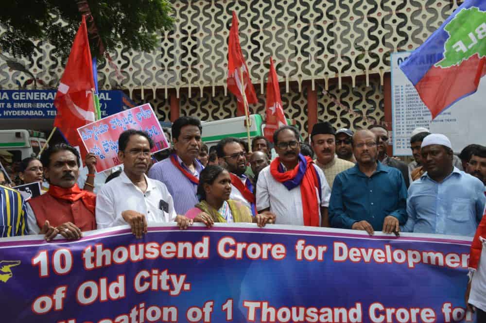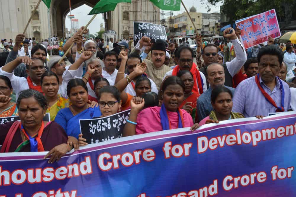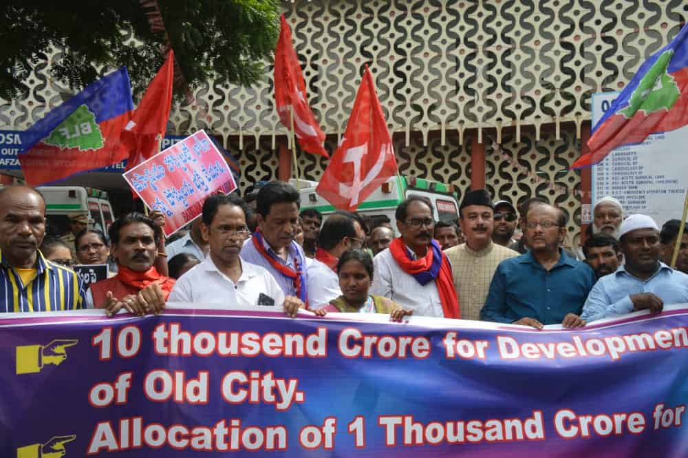 Bahujan Left Front (BLF) led by T. Veerabhadram and Majeedullah Khan Farhath stagged a dharna for delay in 2BHK scheme and shifting the Charminar bus depot and rehabilitation of displaced hawkers on Wednesday in Hyderabad. (Pics. Murli)Bahujan Left Front (BLF) led by T. Veerabhadram and Majeedullah Khan Farhath stagged a dharna for delay in 2BHK scheme and shifting the Charminar bus depot and rehabilitation of displaced hawkers on Wednesday in Hyderabad. (Pics. Murli)