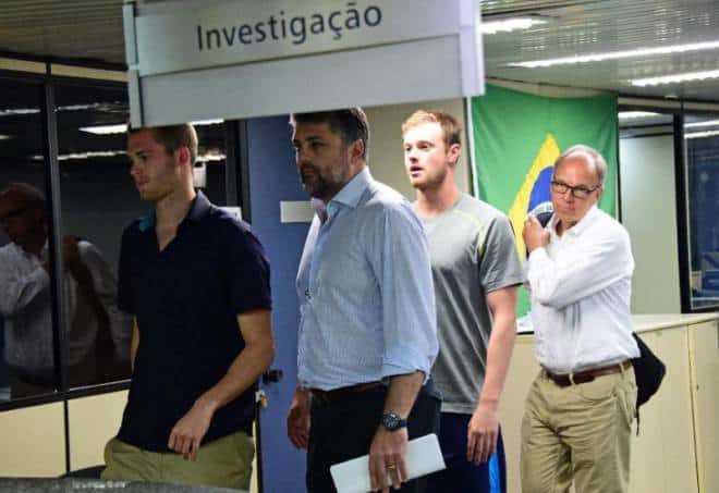 Globo, a leading Brazilian news organization, posted a video online showing the two swimmers walking into a police station.
