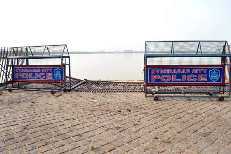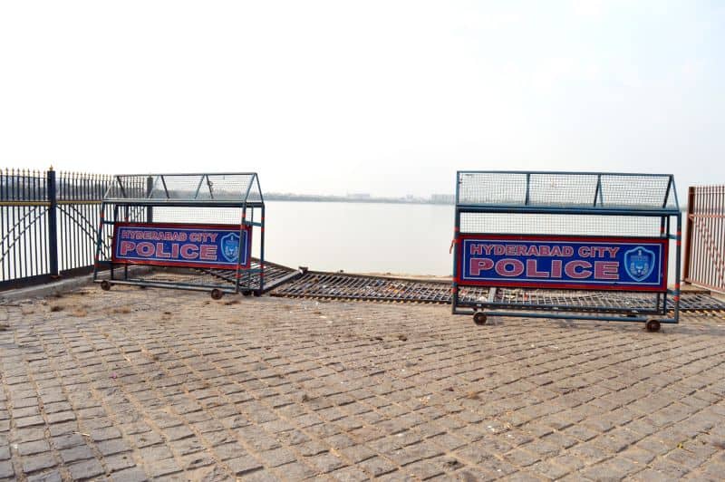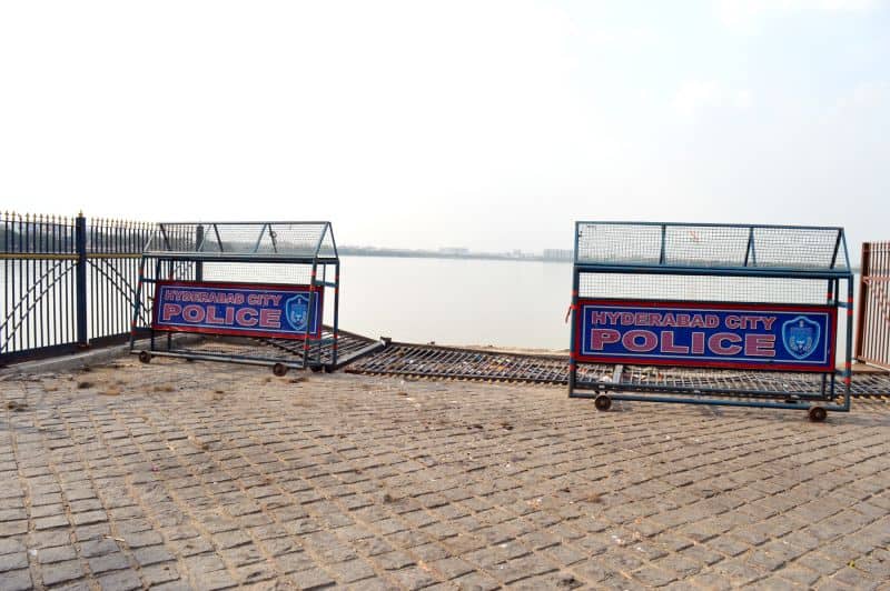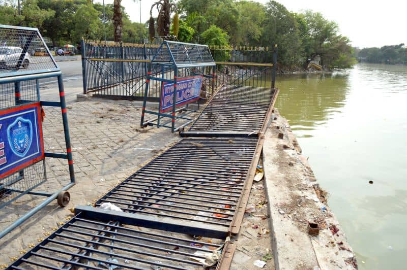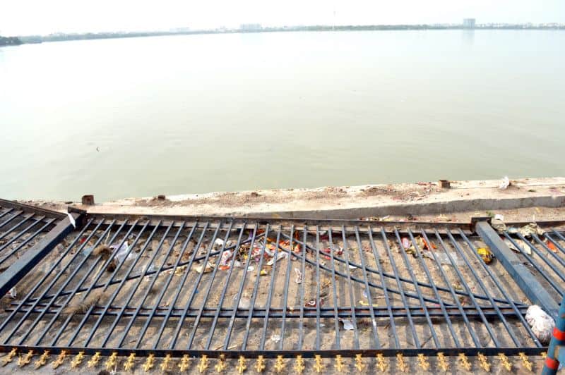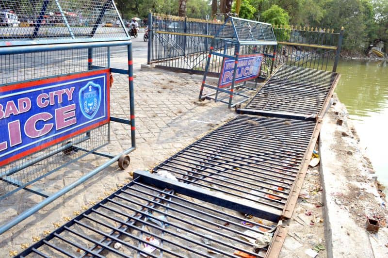Greater Hyderabad Municipal Corporations (GHMC) authorities ignores the broken encirclement of grilles around the Hussain Sagar posing threat to the pedestrians and visitors in Hyderabad on Thursday. (Pics. Murli)