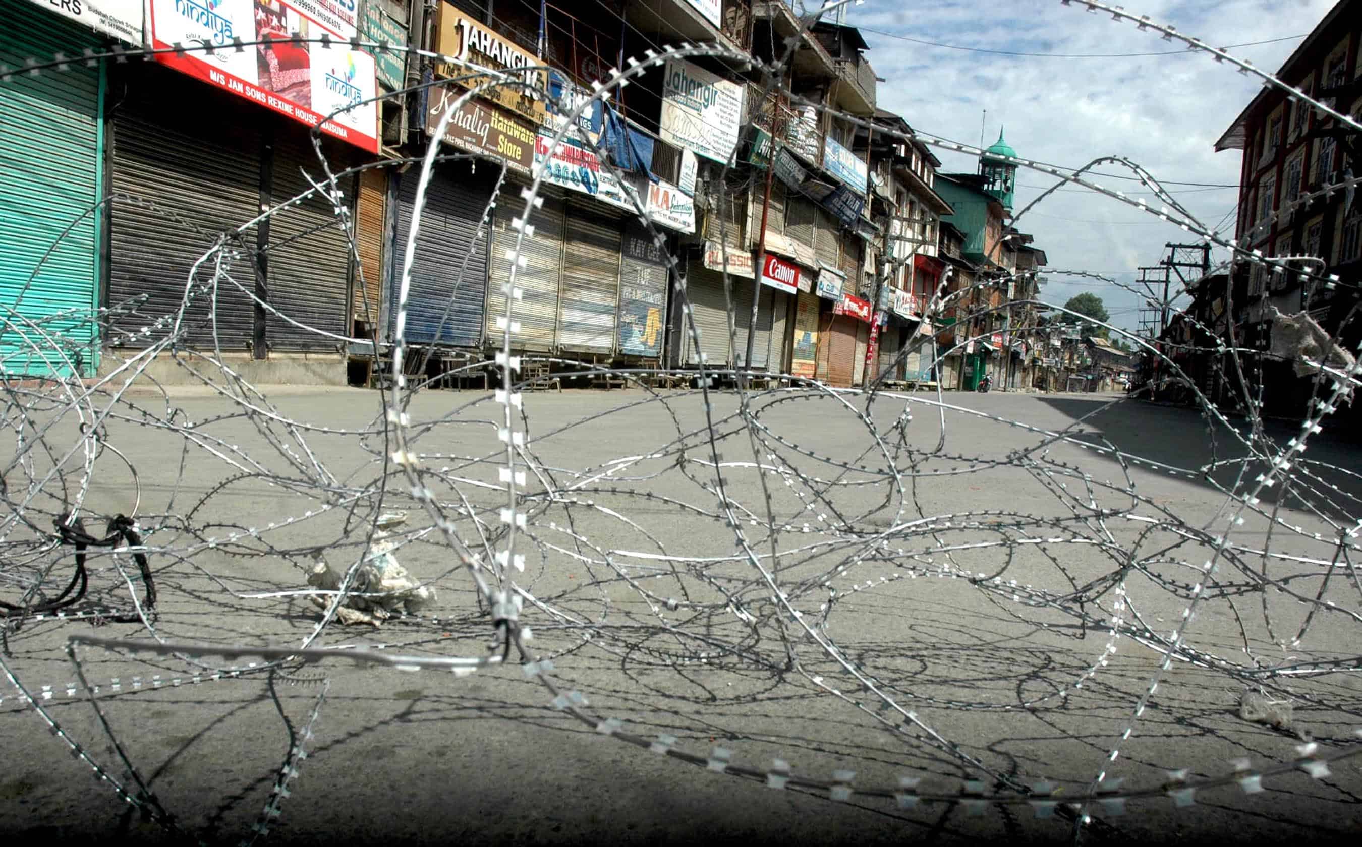 SRINAGAR, AUG 23 (UNI):-Concertina wire put on the main Maisuma road in Srinagar to enforce strict curfew on the 46th day on Tuesday. UNI PHOTO -12U