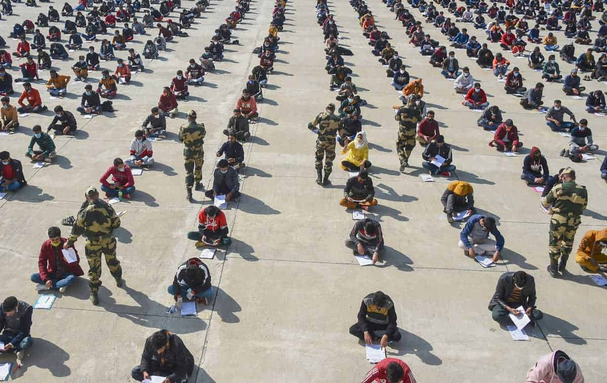 Srinagar: Aspirants appear in an entrance exam, conducted by Border Security Force (BSF) during a recruitment rally, at Humhama on the outskirts of Srinagar, Sunday, Oct. 18, 2020. BSF held the second round of recruitment in the form of written test at its nine centres in Jammu & Kashmir and Ladakh. (PTI Photo/S. Irfan)