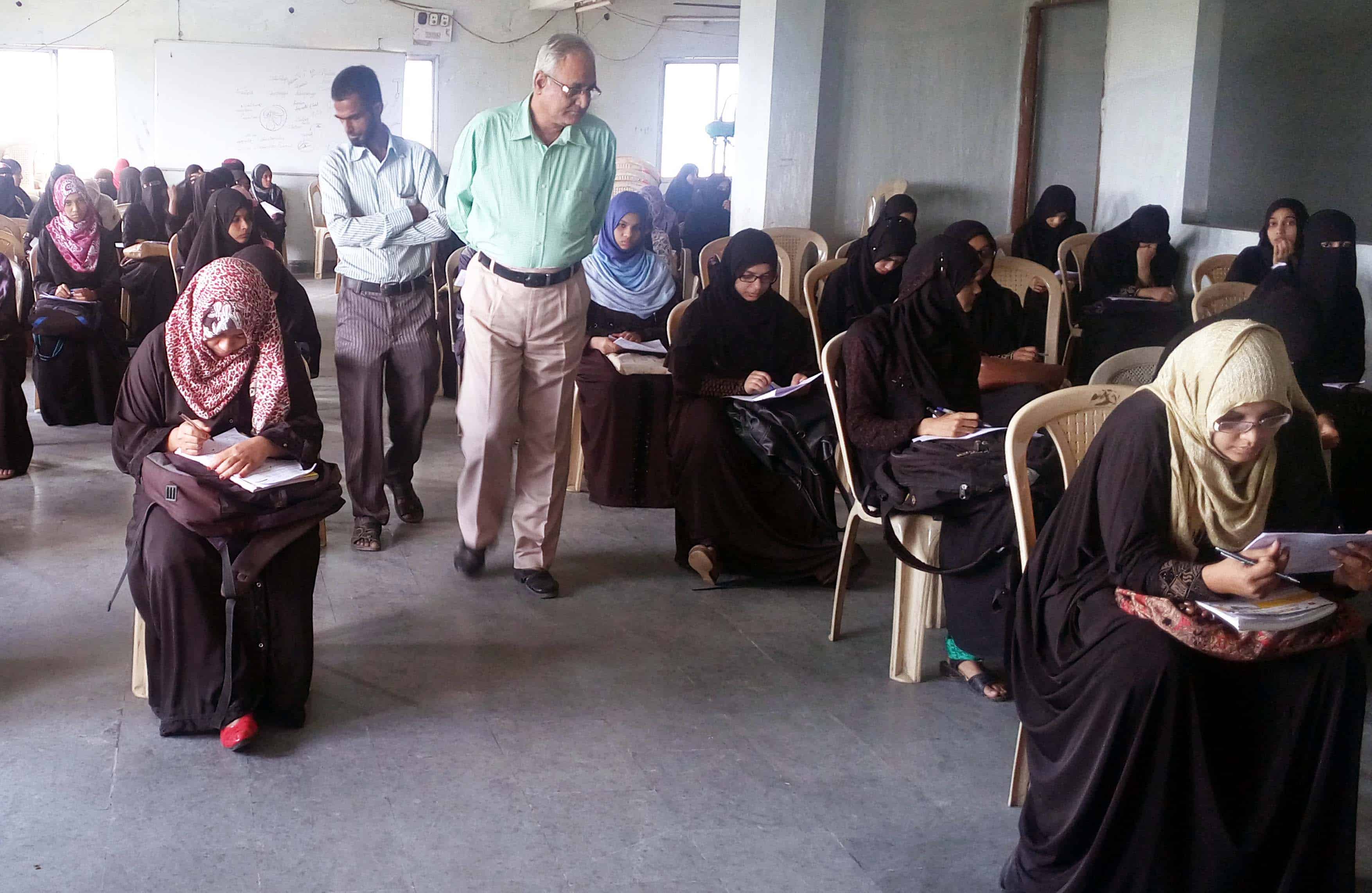 A section of students can be seen at Abid Ali Khan Eye Hospital writing BUMS MOCK EXAMS. Dr. Ghousuddin and Syed Khalid Mohiuddin Asad are invigilating. Photo:Laeeq