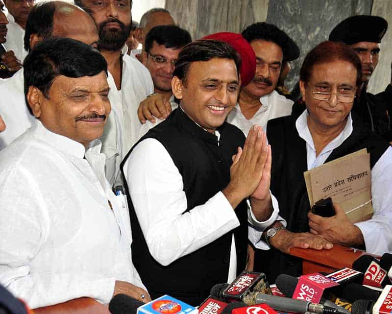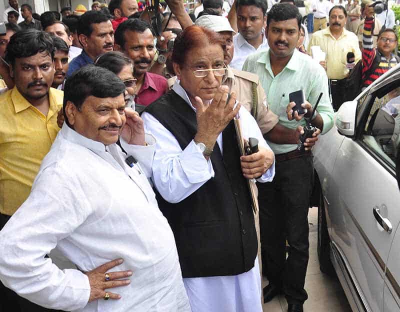Cabinet minister and SP state president Shivpal Singh Yadav(L) and Azam Khan (R) looks on.