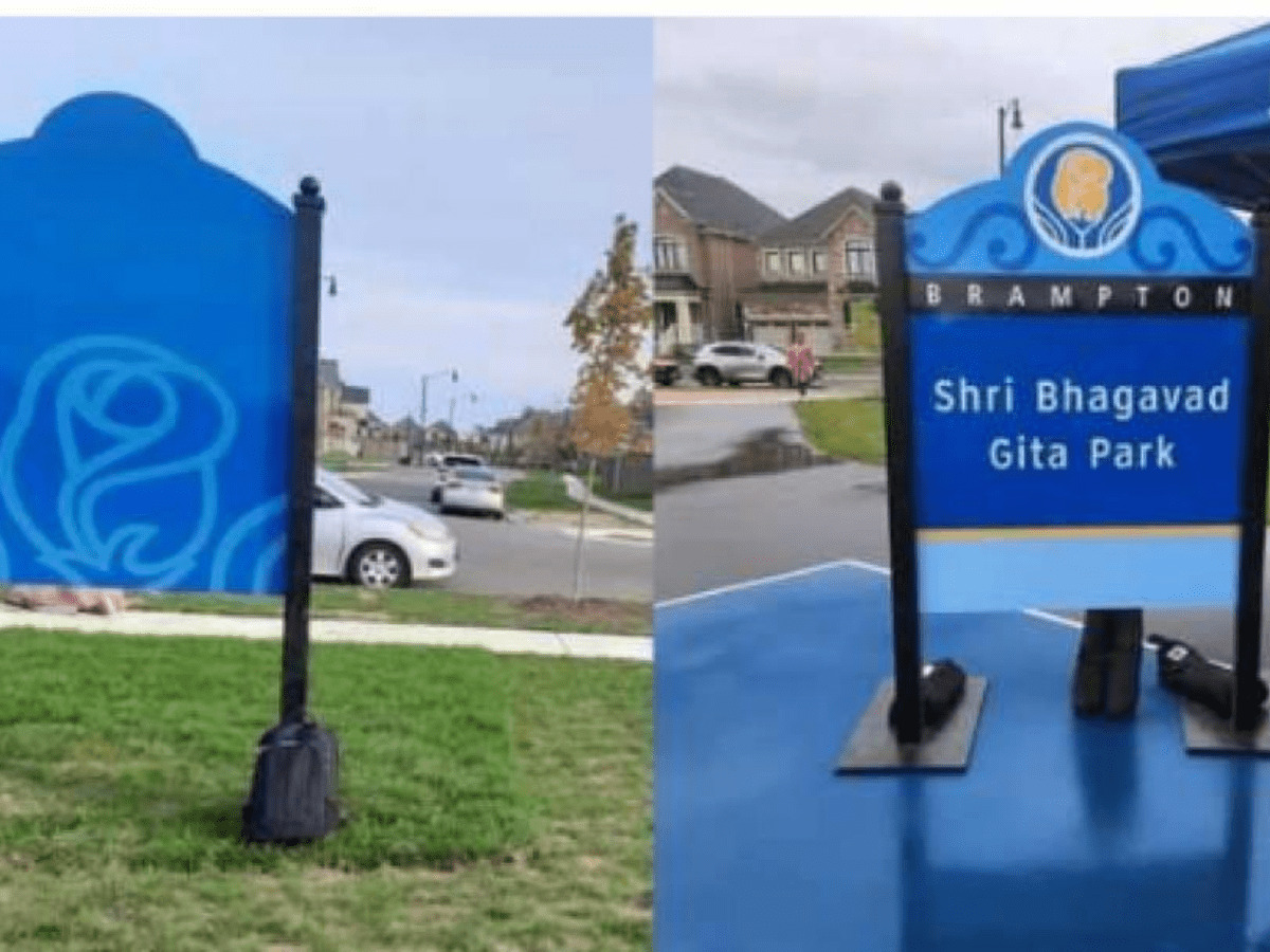 Vandalism was reported when a recently unveiled Shri Bhagavad Gita Park signboard was damaged in Brampton in Canada.