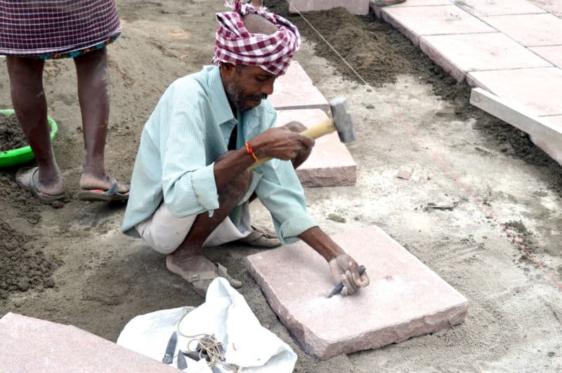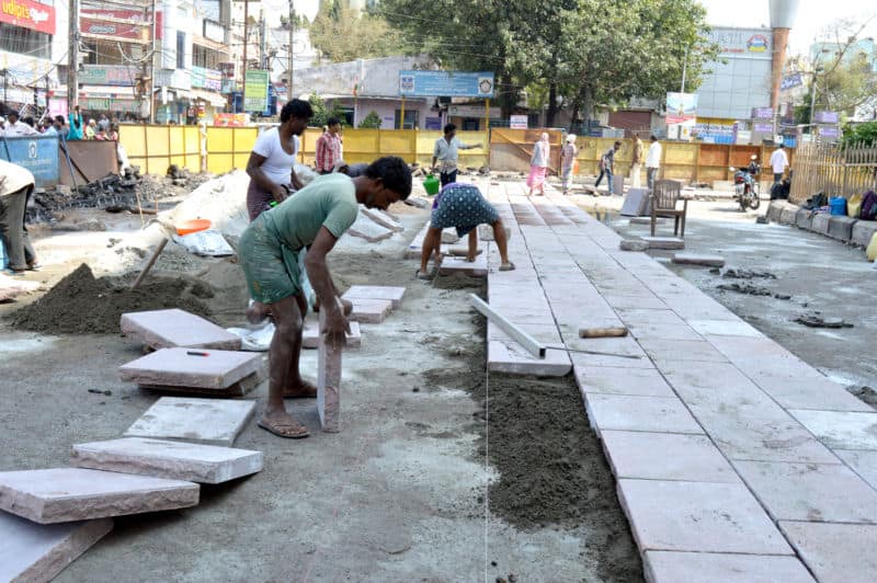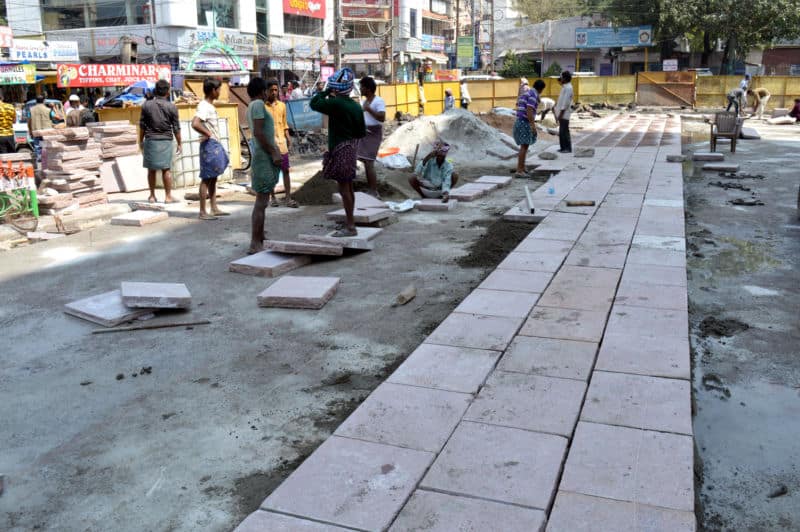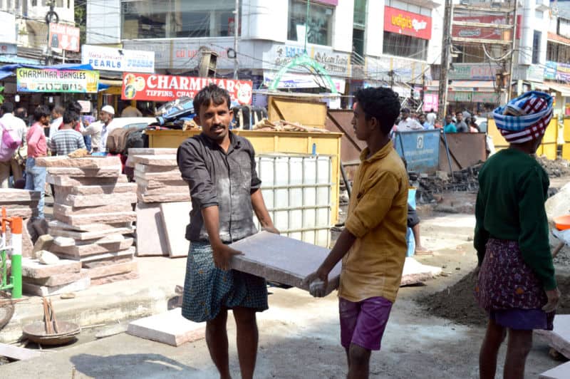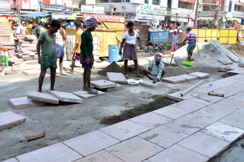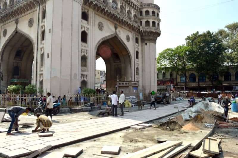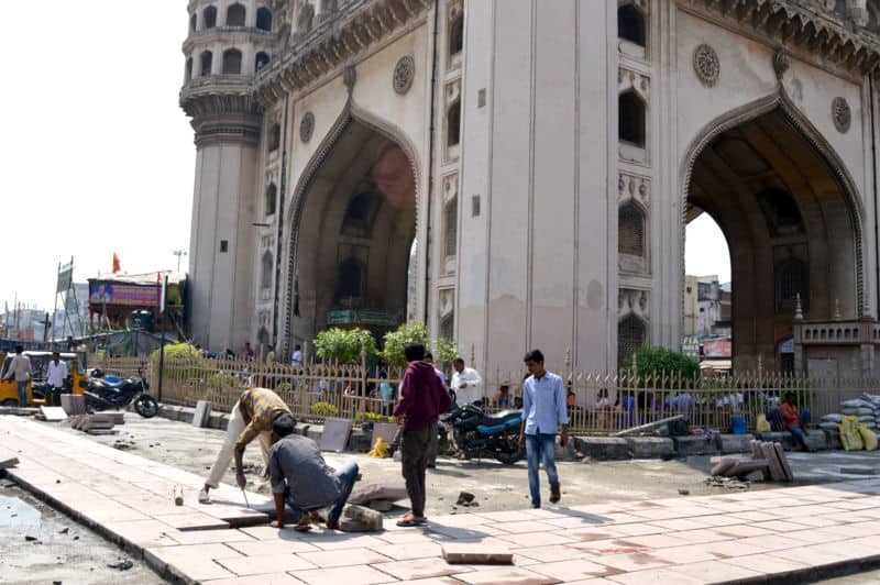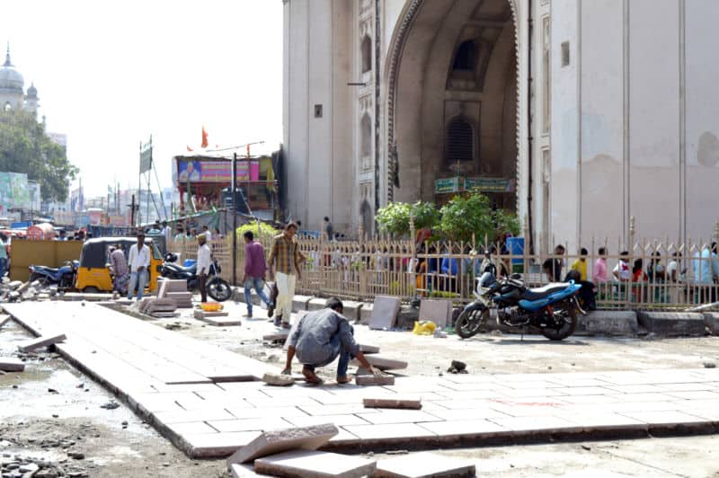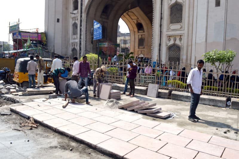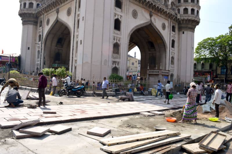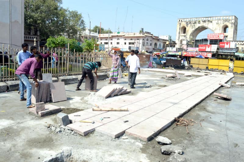Workers laying paving stones as part of the pedestrianisation project, in the immediate vicinity of historic monument Charminar on Thursday. (Photo: Murli)