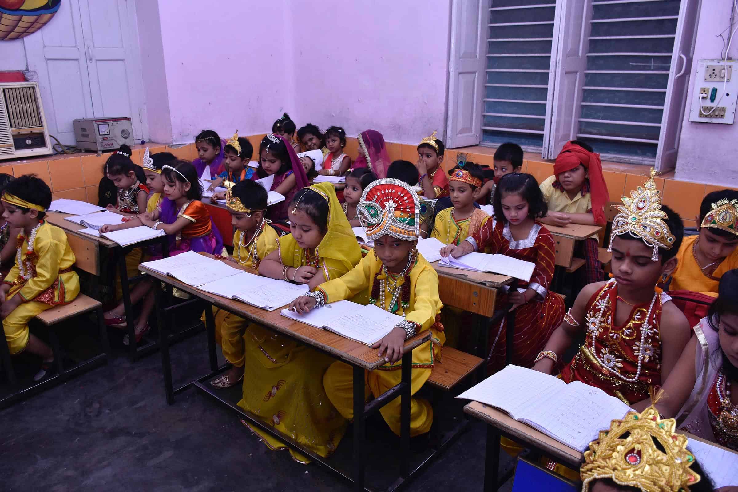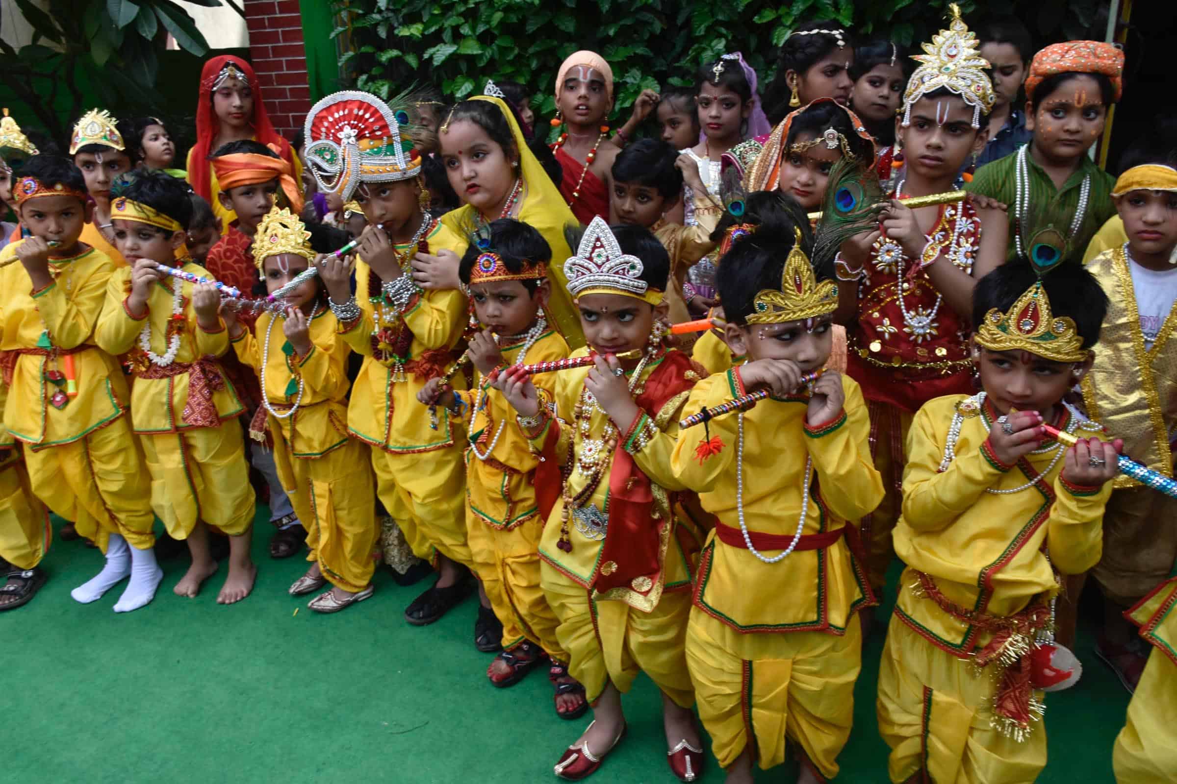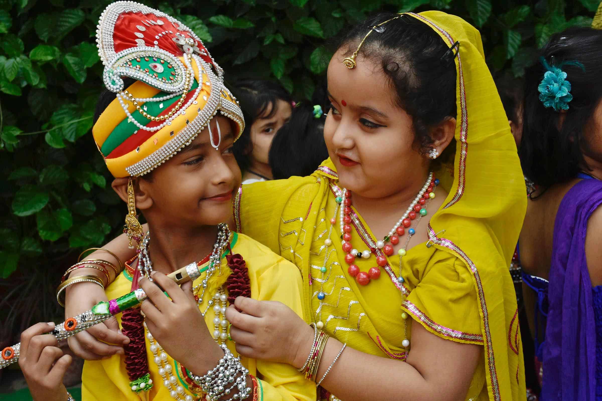Children dresses as Lord Krishna and Radha during a fancy dress competition at their school, ahead of Janmashtami festival in Patna on Tuesday. UNI PHOTO