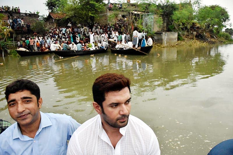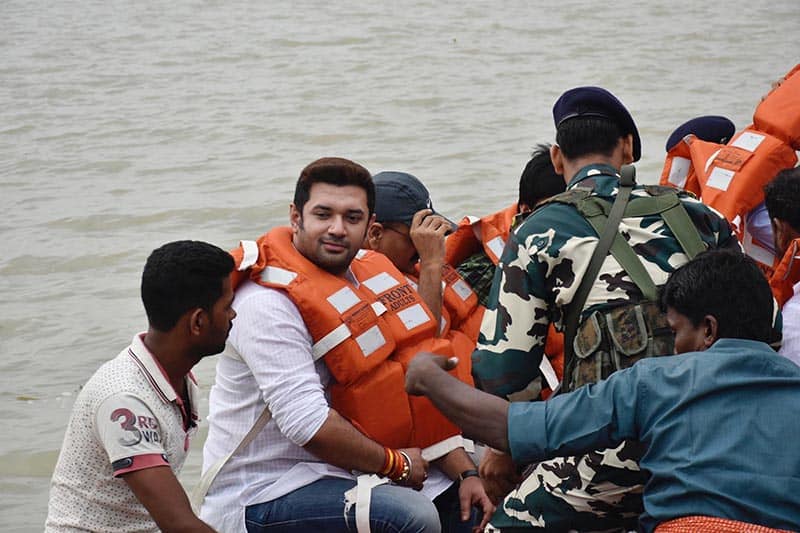 LJP MP Chirag Paswan visit flood affected village of Panapur in Sheikhpura on Saturday. UNI PHOTO