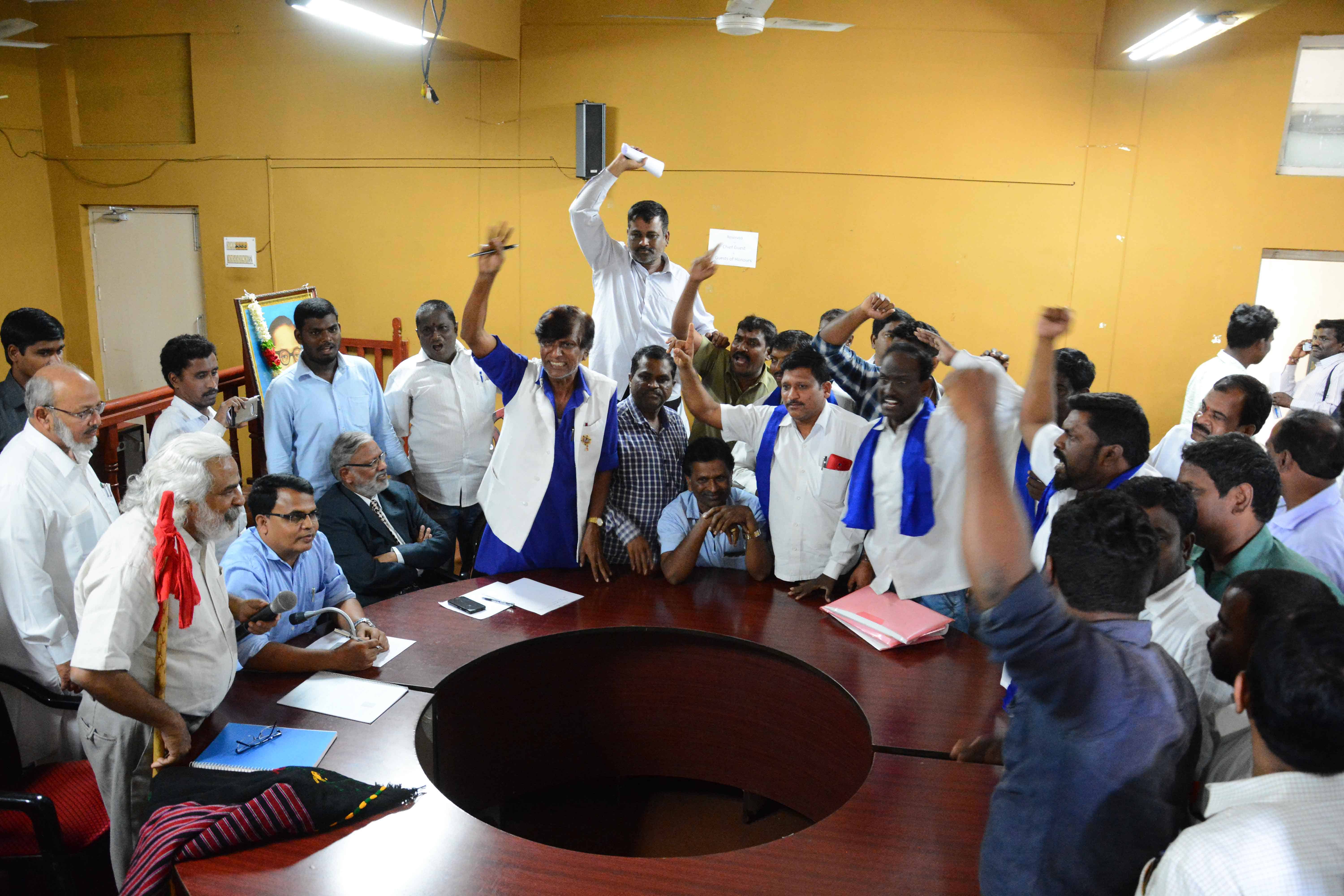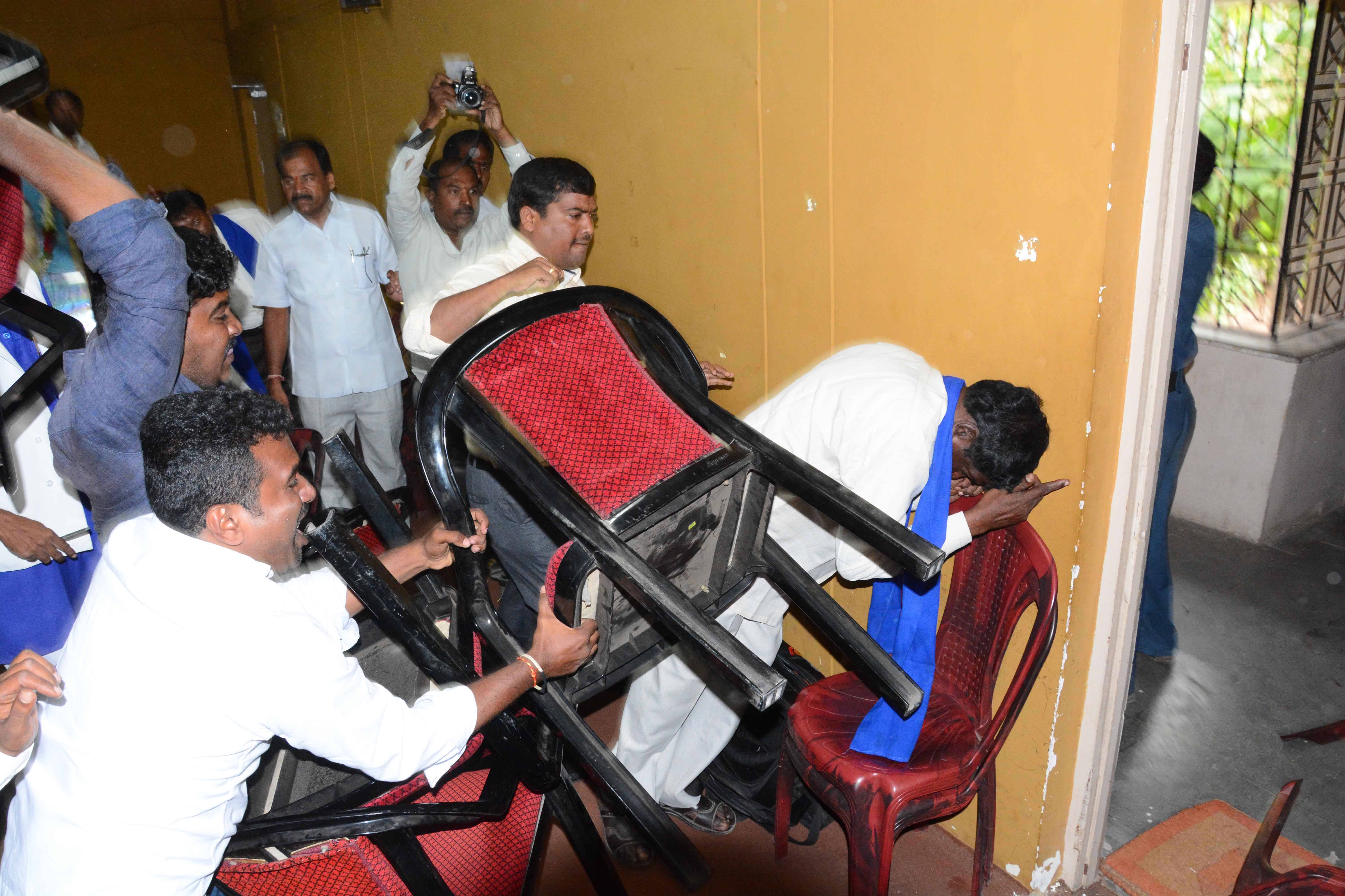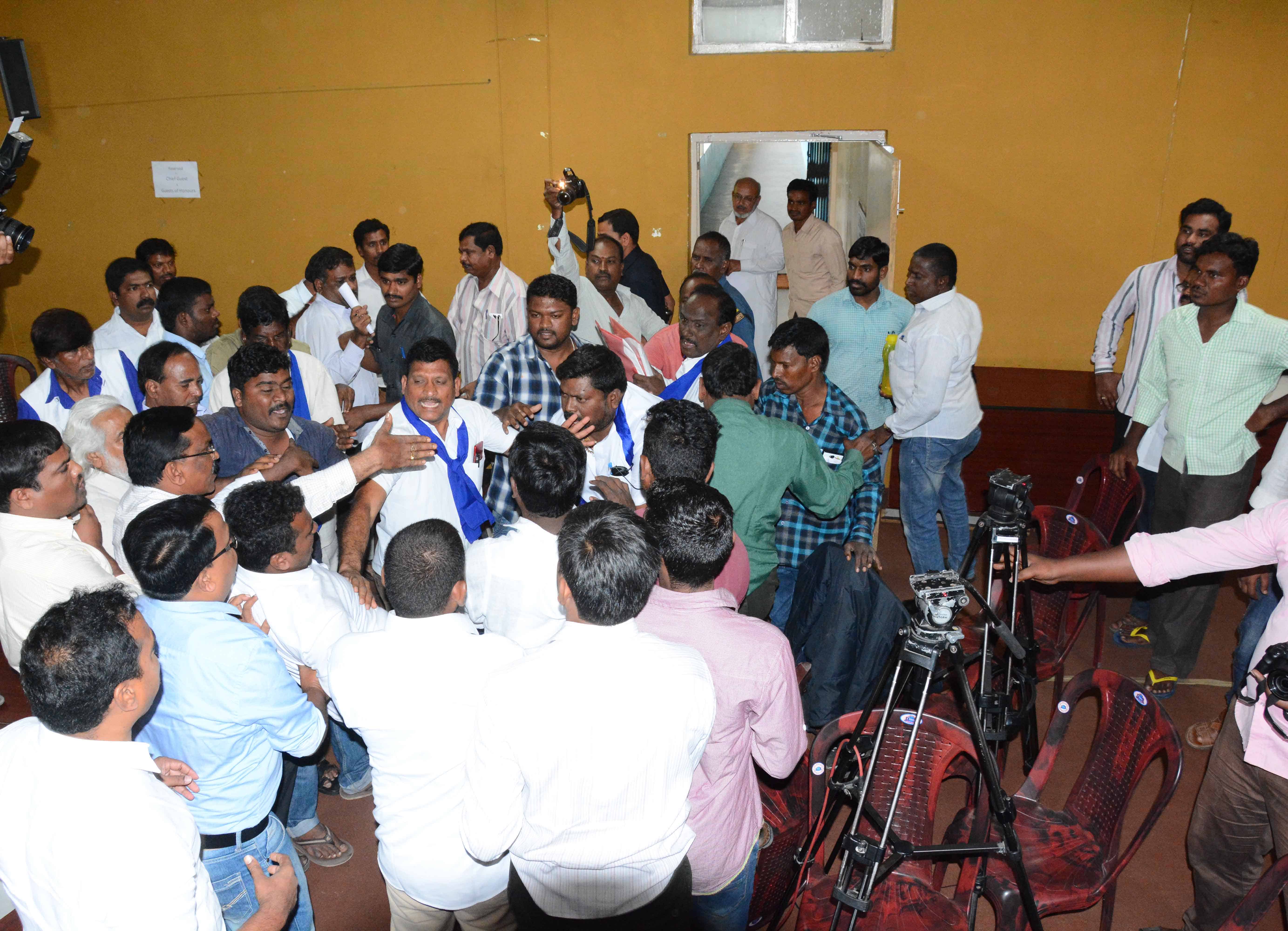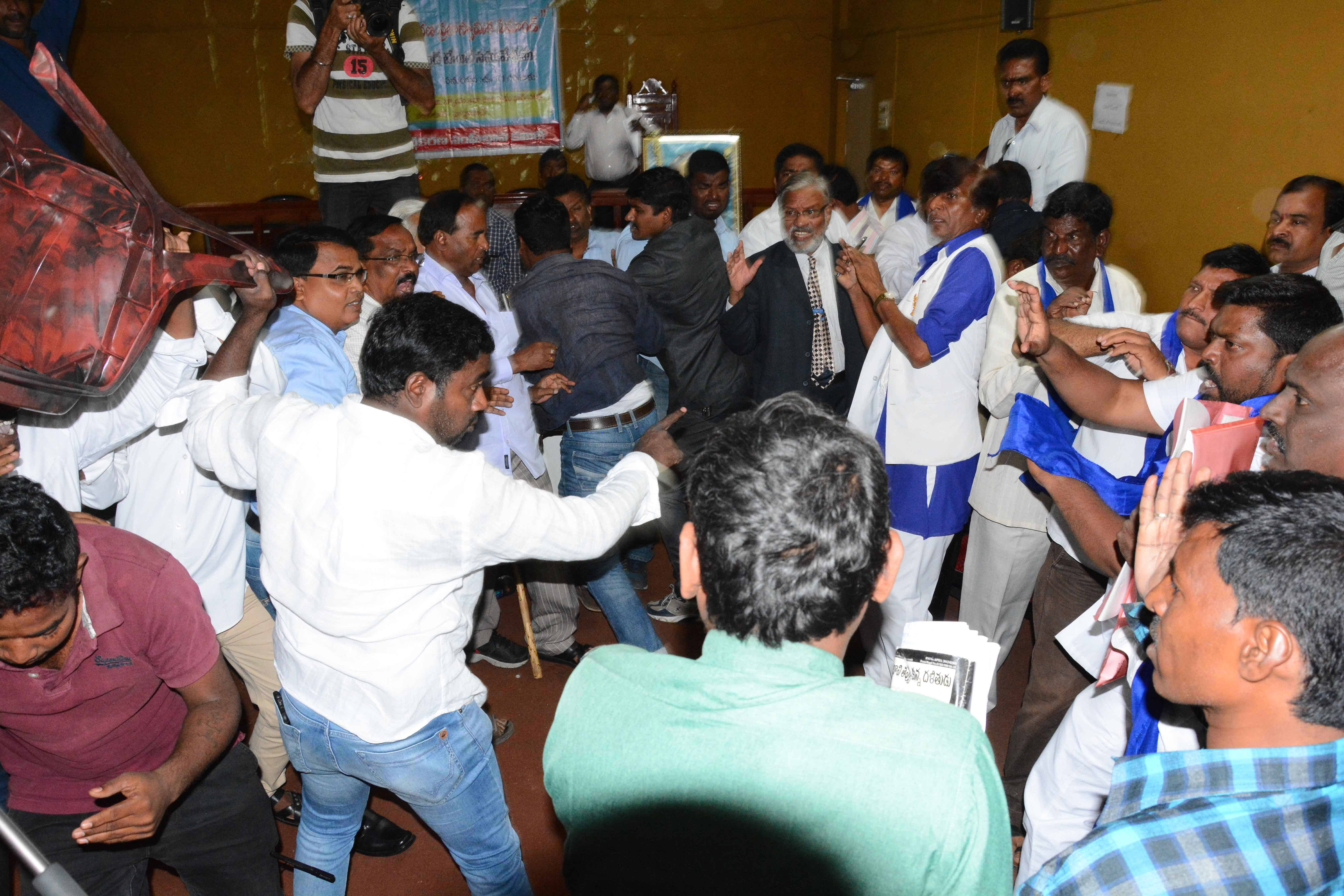 Clash took place between Mala and Madigas during round table meet on SC categorization at Amedkar PG Law Collage. Princple Amedkar PG Law Collage Gali Vinod Kumar was seriously injured during the clash. (Photo: Zabi)