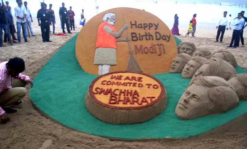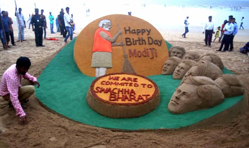 Renowned sand artist Sudarsan Pattnaik has created a Sand sculpture of Prime Minister Narendra Modi’s birthday with the message of ‘We are Committed to Swachh Bharat’ at Juhu Beach in Mumbai on Friday. UNI PHOTO