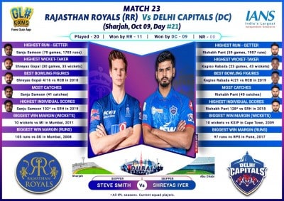 Sharjah, Oct 9 (IANS/GloFans) A struggling Steve Smith-led Rajasthan Royals (RR) will aim to get back to winning ways when they face a confident Delhi Capitals (DC) in the 23rd match of the Indian Premier League (IPL) at the Sharjah Cricket Stadium here on Friday.