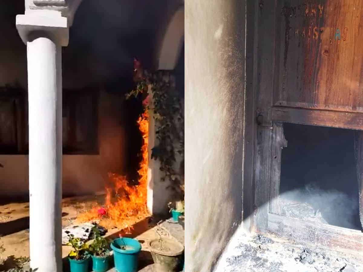 In a video, two people can be seen dousing out fire while the pictures show tall flames of fire and a charred door and shattered windows.
