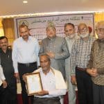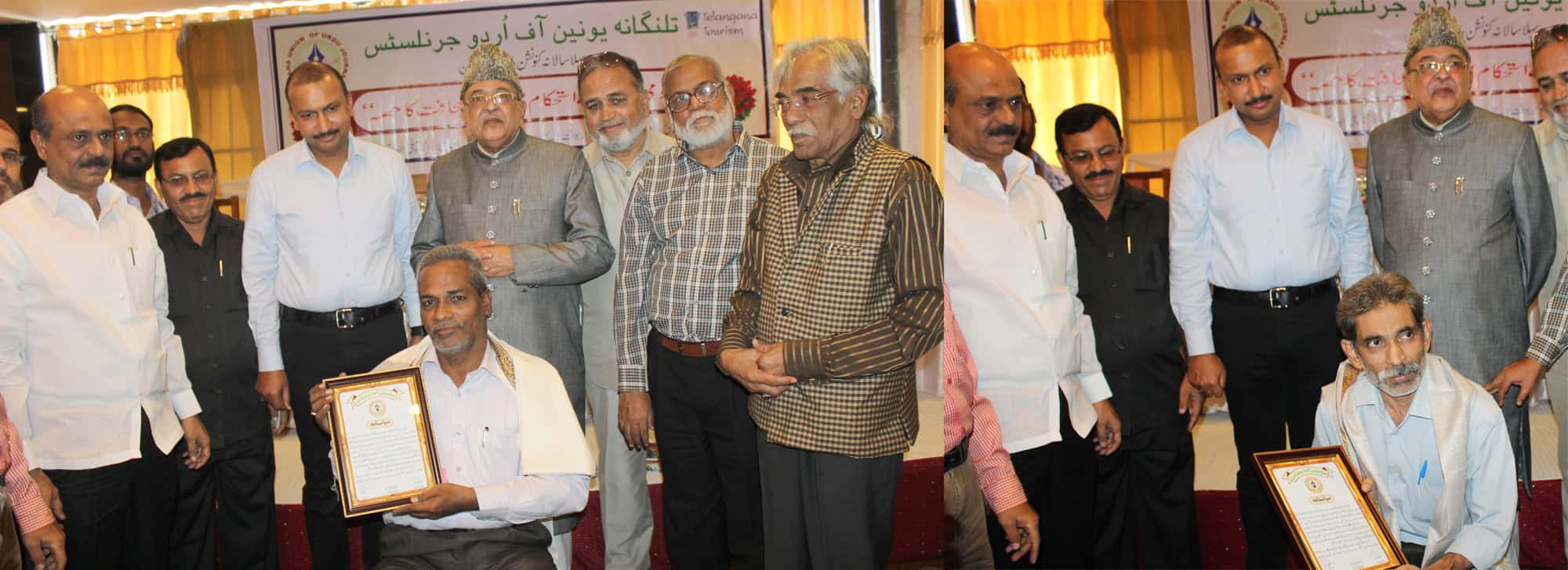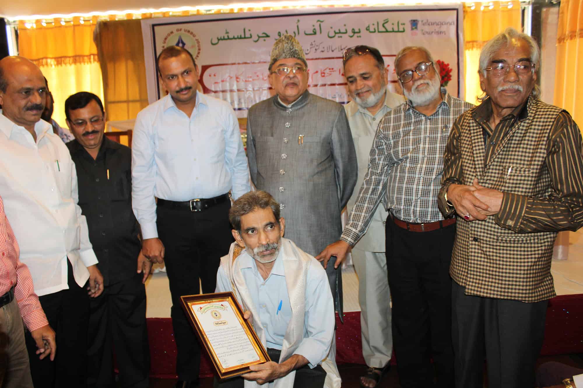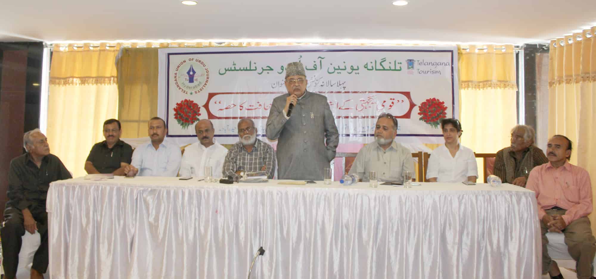 Chief Editor Siasat Daily, Mr. Zahed Ali Khan declared role of Urdu newspapers in freedom struggle as remarkable and said today there is no one to look after the Urdu language and journalism. He lamented that even after 60 years, Urdu speaking people have not got the position they long for. Mr. Zahed Ali Khan was addressing the first annual convention by Telangana Union of Urdu Journalists entitled ‘Role of Urdu journalism in reinforcement of National Integration’ as chief guest. The convention was held under the chairmanship of Mr. Aalam Mehdi. Commissioner INPR Mr. Naveen Mittal, Secretary Urdu Academy Telangana State Prof. S A Shukoor, Prof. P L Vishweshwar Rao former HoD, Journalism, OU, Mr. Aslam Farshouri, Rani Thote, Mr. Hadi Raheel addressed the convention. (Photo: Zabi)