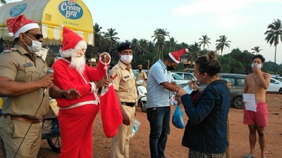 Dressed as Santa Claus, police personnel attached to the Pernem police station distributed masks to the people in a bid to create awareness about Covid-19 and spread the message of social distancing.