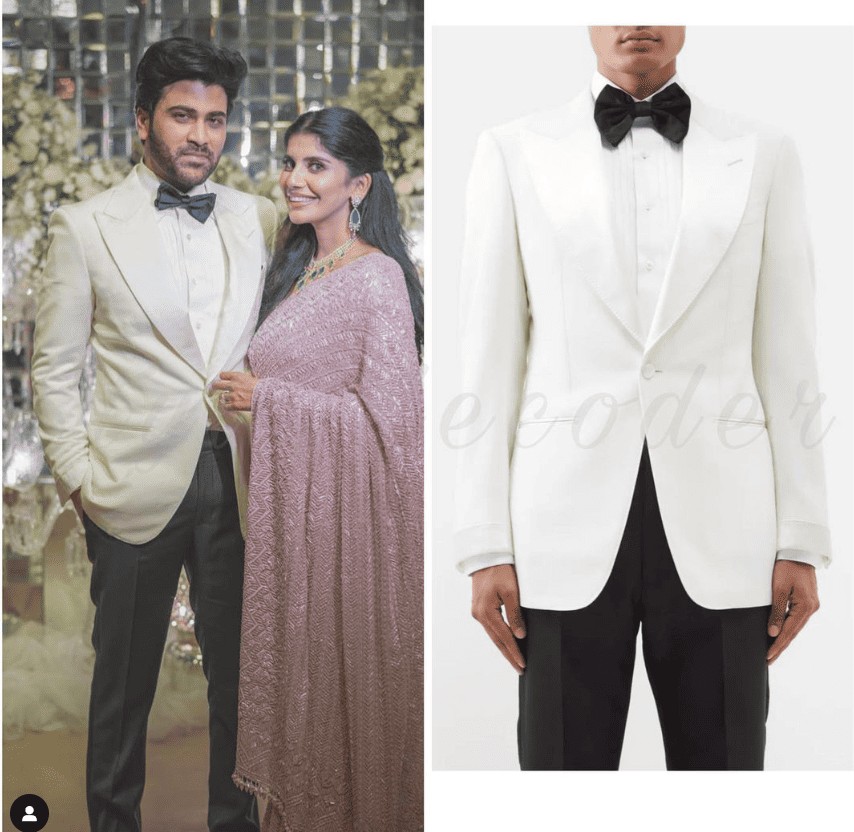 Sharwanand stole the show with his dapper reception outfit on June 9 in Hyderabad. He exuded sophistication and charm while dressed in a Tomford Atticus satin lapel wool blend tuxedo jacket worth Rs. 3,30,943. His choice of attire demonstrated his impeccable fashion sense, leaving the audience in awe of his elegant ensemble.