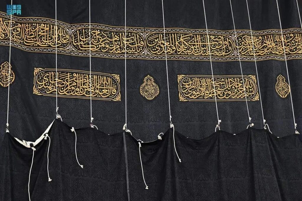 A golden thread adorns the black silk, inscribed with Quranic verses and phrases such as “There is no god but Allah” and “Glory be to Allah.”
