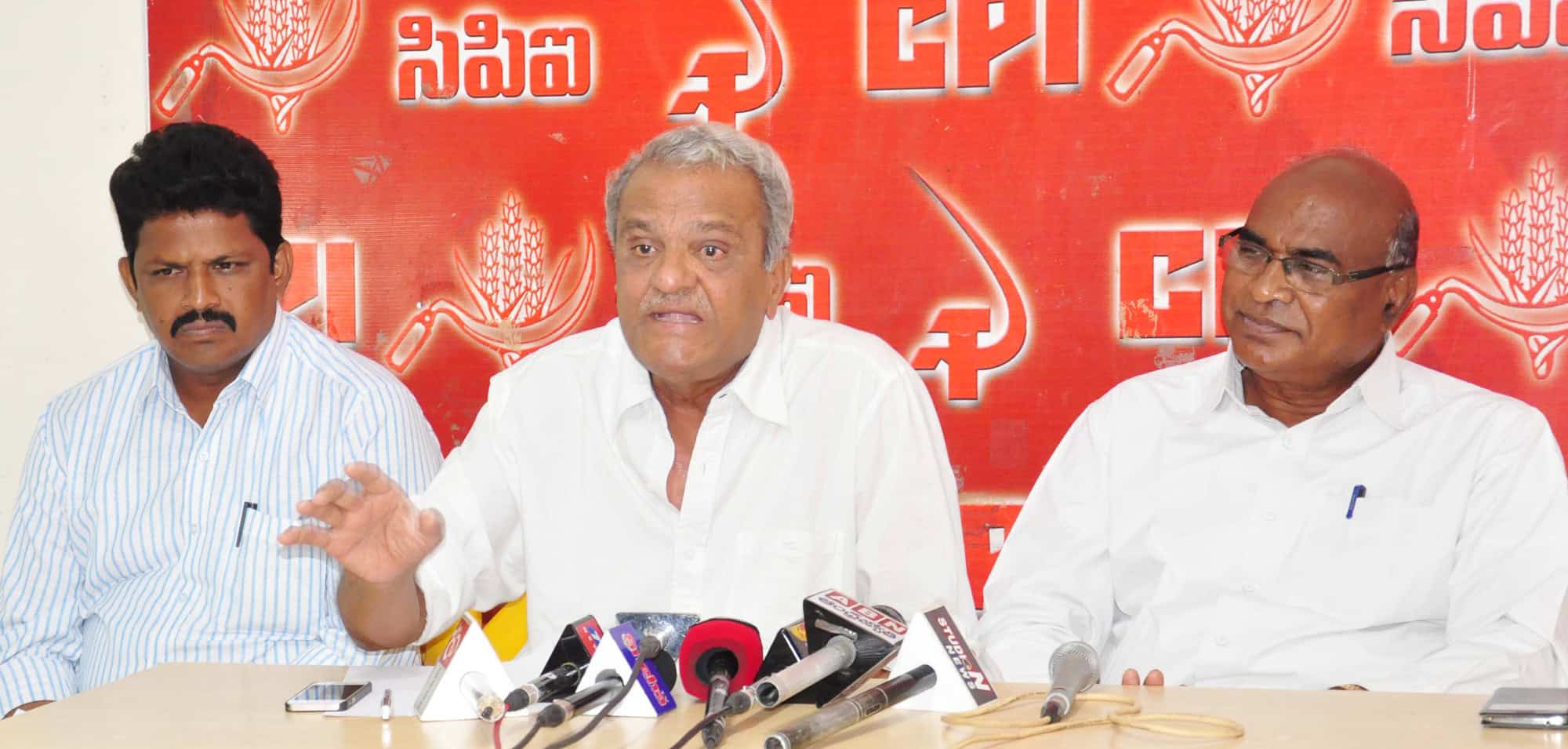 CPI National leader Dr K Narayana during a press conference at party headquarter Maqdoom Bhavan demands central government for special status to Andhra. CPI Telangana State General Secretary Chada Venkat Reddy and others can also be seen. (Photo: Zabi)