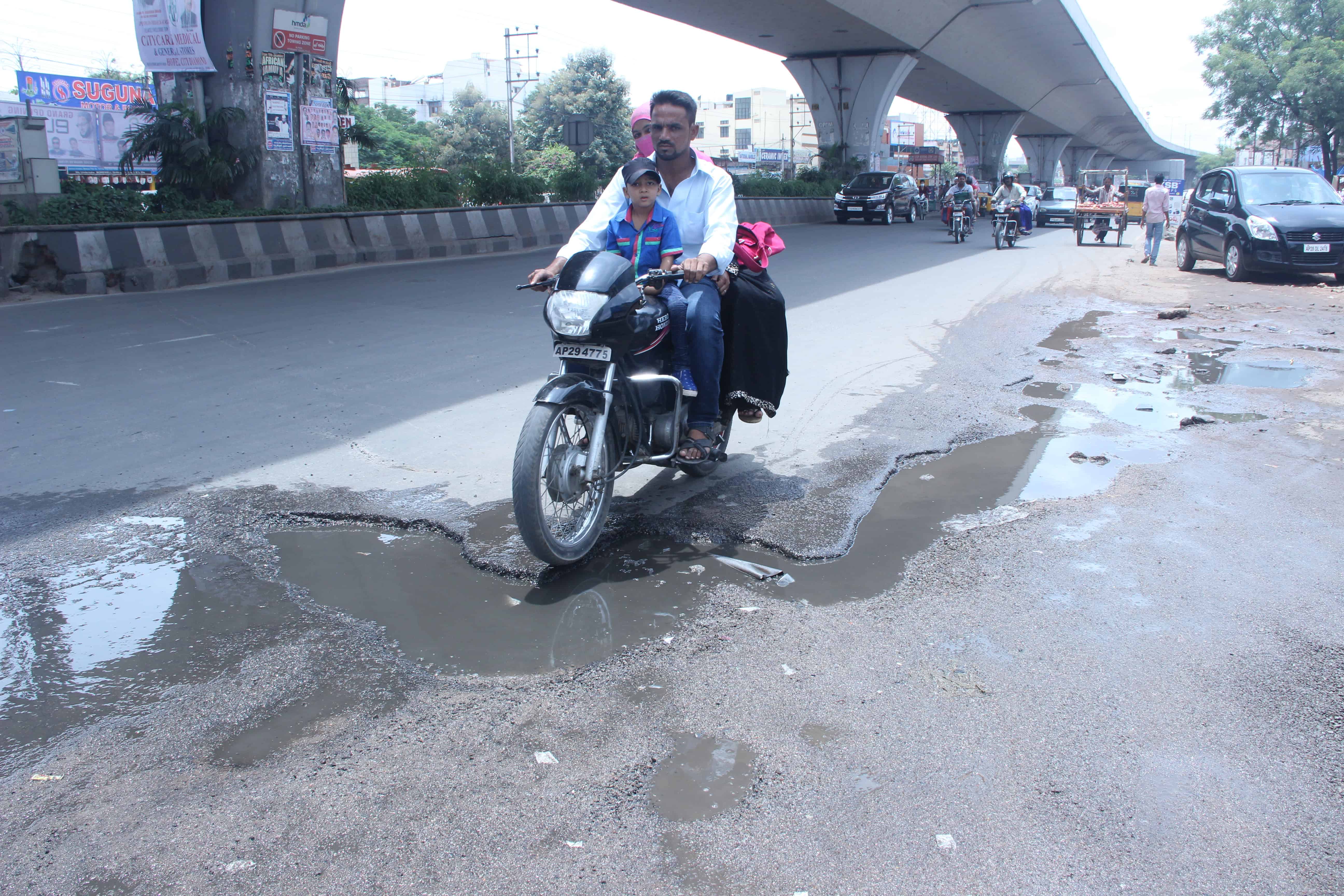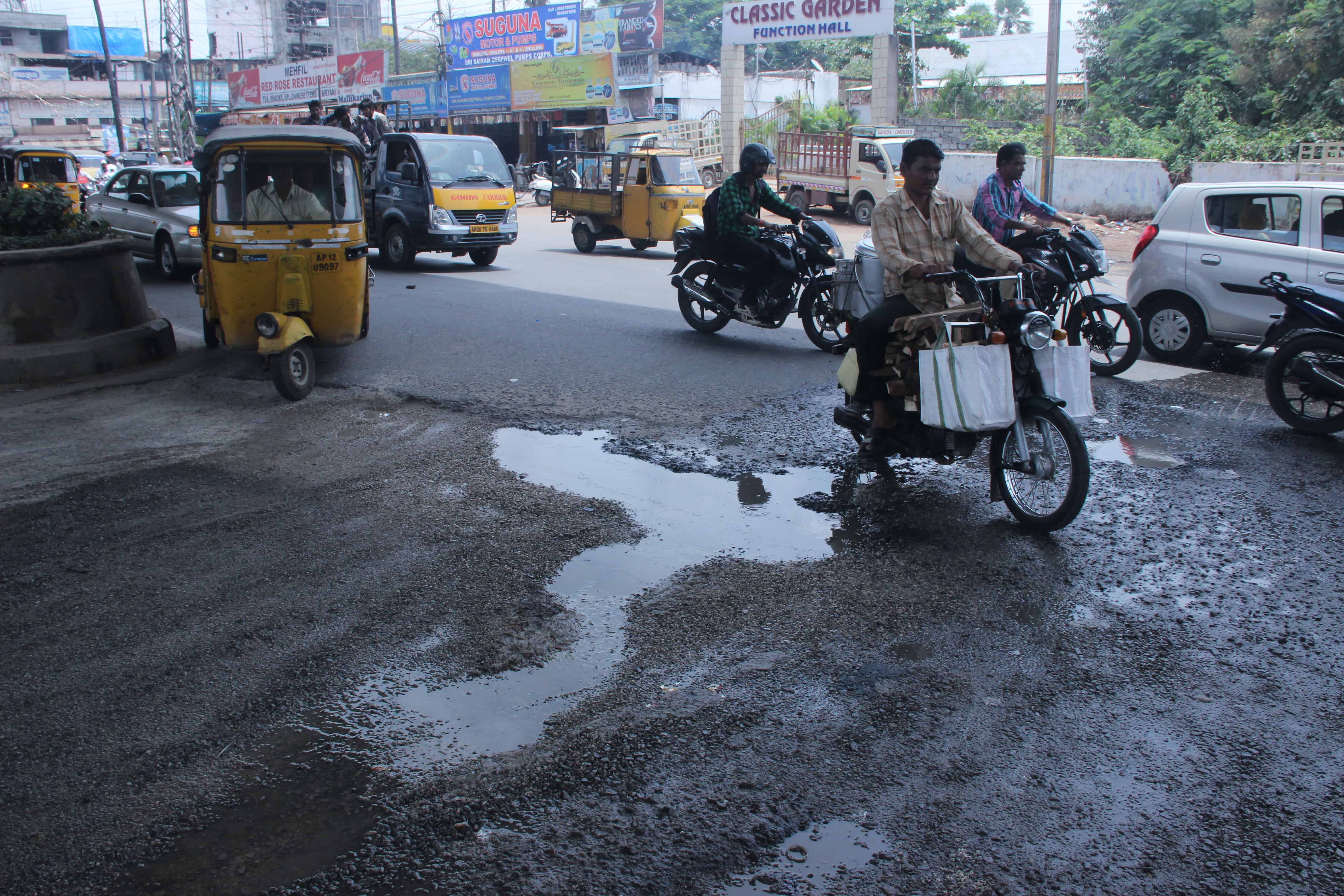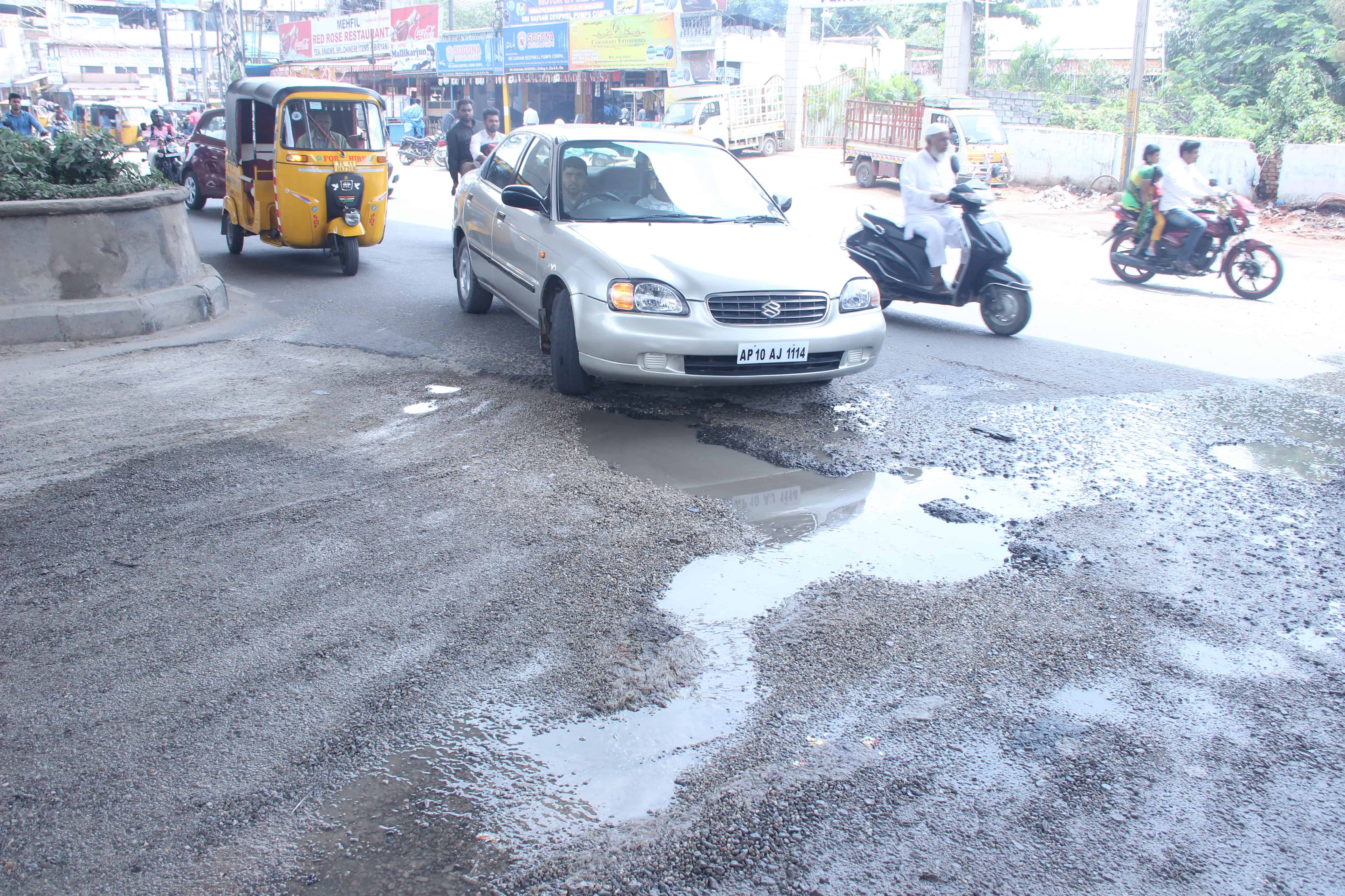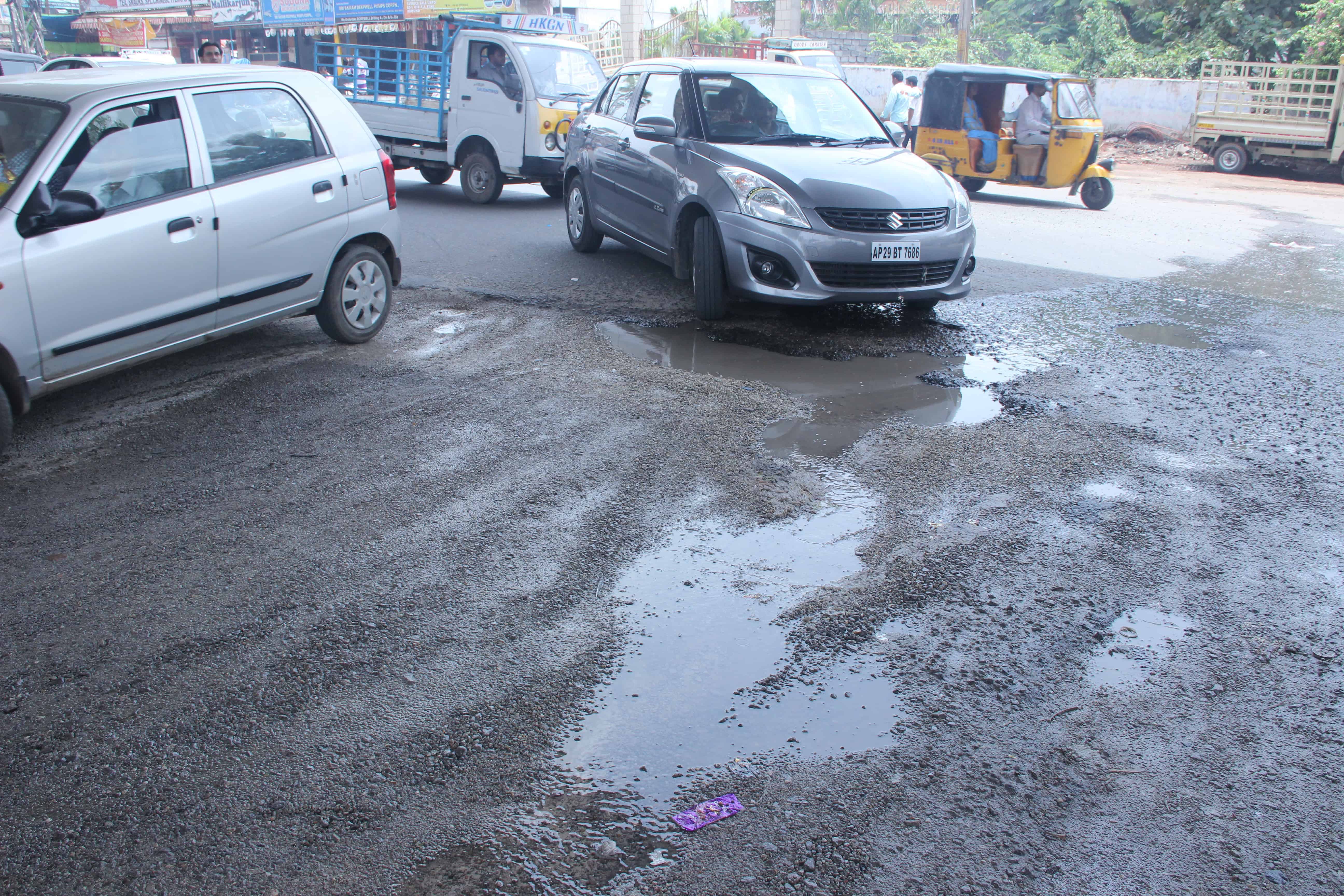 The damaged road near pillar No. 104 can be seen making it difficult for the movement of vehicular traffic. There is a threat of accidents also existed on this stretch.Photo:Laeeq