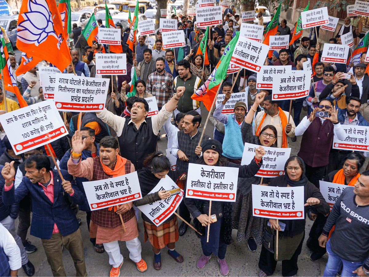 New Delhi: Delhi BJP leaders and workers on Saturday staged a protest at the AAP office here demanding the resignation of Chief Minister Arvind Kejriwal after the ED named him in a charge sheet in the excise scam case.