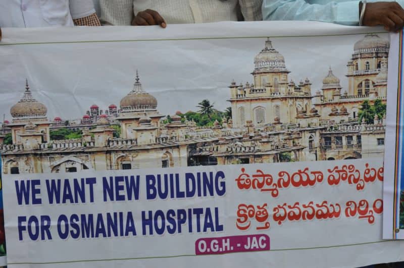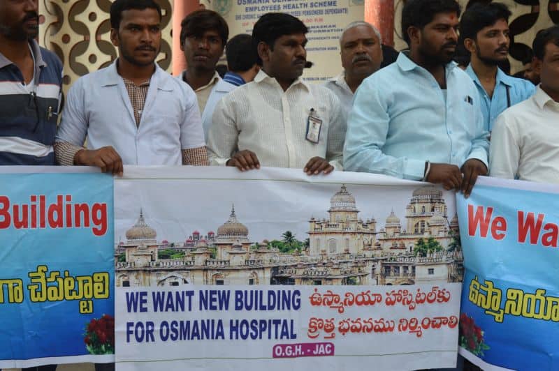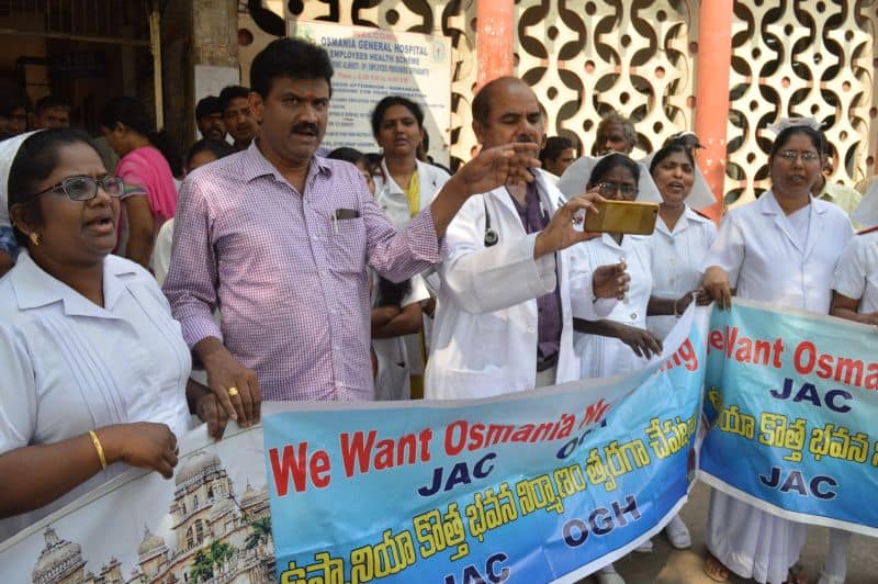 Osmania Hospital doctors and nurses staged a protest outside the building demanding a new premises in place of the existing dilapidated structure. (Photo: Murli)